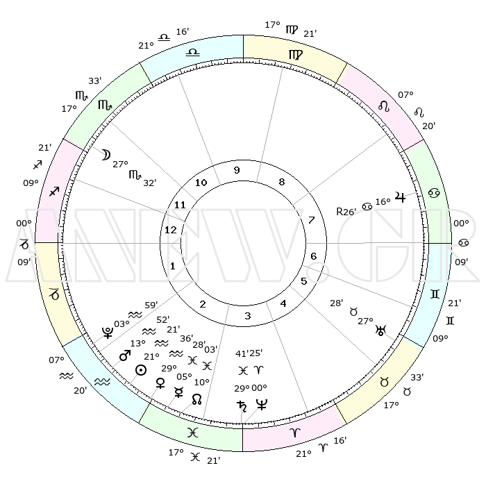 | | ΘΕΣΕΙΣ ΠΛΑΝΗΤΩΝ ΑΣΤΡΟΛΟΓΙΚΟΥ ΧΑΡΤΗ ΤΗΣ ΣΤΙΓΜΗΣ ΑΥΤΗΣ | | | | Πλανήτης | Ζώδιο | Μοίρες | Δεκαήμ. | Σε οίκο | Απόκλιση | | Ακμές των οίκων | | Ηλιος | Υδροχόος | 21°17' | Τρίτο | 3 | 14 S 24 | | 1ος | 09°30' | Τοξότης | | Σελήνη | Σκορπιός | 26°45' | Τρίτο | 12 | 24 S 25 | | 2ος | 12°08' | Αιγόκερως | | Ερμής | Ιχθείς | 05°21' | Πρώτο | 3 | 10 S 23 | | 3ος | 19°27' | Υδροχόος | | Αφροδίτη | Υδροχόος | 29°31' | Τρίτο | 3 | 13 S 00 | | 4ος | 25°27' | Ιχθείς | | Αρης | Υδροχόος | 13°49' | Δεύτερο | 2 | 17 S 42 | | 5ος | 25°09' | Κριός | | Δίας | Καρκίνος | 16°26'R | Δεύτερο | 8 | 22 N 44 | | 6ος | 18°57' | Ταύρος | | Κρόνος | Ιχθείς | 29°41' | Τρίτο | 4 | 02 S 06 | | 7ος | 09°30' | Δίδυμοι | | Ουρανός | Ταύρος | 27°28' | Τρίτο | 6 | 19 N 25 | | 8ος | 12°08' | Καρκίνος | | Ποσειδώνας | Κριός | 00°25' | Πρώτο | 4 | 01 S 02 | | 9ος | 19°27' | Λέων | | Πλούτωνας | Υδροχόος | 03°59' | Πρώτο | 2 | 22 S 58 | | 10ος | 25°27' | Παρθένος | | Β. Δεσμός | Ιχθείς | 10°03' | Δεύτερο | 3 | 07 S 48 | | 11ος | 25°09' | Ζυγός | | Ωροσκόπος | Τοξότης | 09°30' | Πρώτο | | | 12ος | 18°57' | Σκορπιός | | Μεσουράνημα | Παρθένος | 25°27' | Τρίτο | | | |