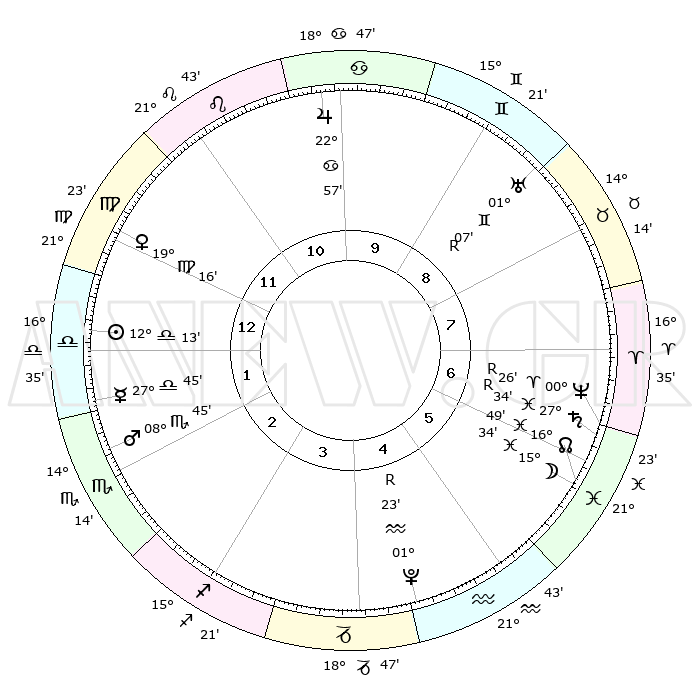 | ΘΕΣΕΙΣ ΠΛΑΝΗΤΩΝ ΑΣΤΡΟΛΟΓΙΚΟΥ ΧΑΡΤΗ ΤΗΣ ΣΤΙΓΜΗΣ ΑΥΤΗΣ | | Πλανήτης | Ζώδιο | Μοίρες | Δεκαήμ. | Σε οίκο | Απόκλιση | | Ακμές των οίκων | Ηλιος | Ζυγός | 11°60' | Δεύτερο | 3 | 04 S 44 | | 1ος | 11°45' | Λέων | Σελήνη | Ιχθείς | 12°26' | Δεύτερο | 8 | 07 S 23 | | 2ος | 03°44' | Παρθένος | Ερμής | Ζυγός | 27°24' | Τρίτο | 3 | 11 S 05 | | 3ος | 00°21' | Ζυγός | Αφροδίτη | Παρθένος | 18°59' | Δεύτερο | 2 | 05 N 37 | | 4ος | 02°34' | Σκορπιός | Αρης | Σκορπιός | 08°36' | Πρώτο | 4 | 14 S 29 | | 5ος | 08°03' | Τοξότης | Δίας | Καρκίνος | 22°56' | Τρίτο | 12 | 21 N 31 | | 6ος | 11°58' | Αιγόκερως | Κρόνος | Ιχθείς | 27°35'R | Τρίτο | 8 | 03 S 16 | | 7ος | 11°45' | Υδροχόος | Ουρανός | Δίδυμοι | 01°07'R | Πρώτο | 10 | 20 N 10 | | 8ος | 03°44' | Ιχθείς | Ποσειδώνας | Κριός | 00°26'R | Πρώτο | 9 | 01 S 05 | | 9ος | 00°21' | Κριός | Πλούτωνας | Υδροχόος | 01°23'R | Πρώτο | 6 | 23 S 32 | | 10ος | 02°34' | Ταύρος | Β. Δεσμός | Ιχθείς | 16°50' | Δεύτερο | 8 | 05 S 12 | | 11ος | 08°03' | Δίδυμοι | Ωροσκόπος | Λέων | 11°45' | Δεύτερο | | | 12ος | 11°58' | Καρκίνος | Μεσουράνημα | Ταύρος | 02°34' | Πρώτο | | | |
