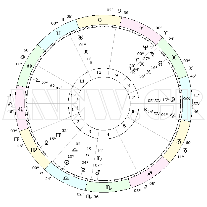 | ΘΕΣΕΙΣ ΠΛΑΝΗΤΩΝ ΑΣΤΡΟΛΟΓΙΚΟΥ ΧΑΡΤΗ ΤΗΣ ΣΤΙΓΜΗΣ ΑΥΤΗΣ | | Πλανήτης | Ζώδιο | Μοίρες | Δεκαήμ. | Σε οίκο | Απόκλιση | | Ακμές των οίκων | Ηλιος | Ζυγός | 09°58' | Πρώτο | 4 | 03 S 57 | | 1ος | 22°29' | Καρκίνος | Σελήνη | Υδροχόος | 14°13' | Δεύτερο | 8 | 19 S 23 | | 2ος | 13°07' | Λέων | Ερμής | Ζυγός | 24°13' | Τρίτο | 4 | 09 S 42 | | 3ος | 07°10' | Παρθένος | Αφροδίτη | Παρθένος | 16°27' | Δεύτερο | 3 | 06 N 35 | | 4ος | 07°10' | Ζυγός | Αρης | Σκορπιός | 07°11' | Πρώτο | 4 | 14 S 00 | | 5ος | 13°14' | Σκορπιός | Δίας | Καρκίνος | 22°42' | Τρίτο | 1 | 21 N 33 | | 6ος | 20°12' | Τοξότης | Κρόνος | Ιχθείς | 27°45'R | Τρίτο | 9 | 03 S 12 | | 7ος | 22°29' | Αιγόκερως | Ουρανός | Δίδυμοι | 01°10'R | Πρώτο | 11 | 20 N 11 | | 8ος | 13°07' | Υδροχόος | Ποσειδώνας | Κριός | 00°30'R | Πρώτο | 9 | 01 S 04 | | 9ος | 07°10' | Ιχθείς | Πλούτωνας | Υδροχόος | 01°24'R | Πρώτο | 7 | 23 S 32 | | 10ος | 07°10' | Κριός | Β. Δεσμός | Ιχθείς | 16°56' | Δεύτερο | 9 | 05 S 09 | | 11ος | 13°14' | Ταύρος | Ωροσκόπος | Καρκίνος | 22°29' | Τρίτο | | | 12ος | 20°12' | Δίδυμοι | Μεσουράνημα | Κριός | 07°10' | Πρώτο | | | |