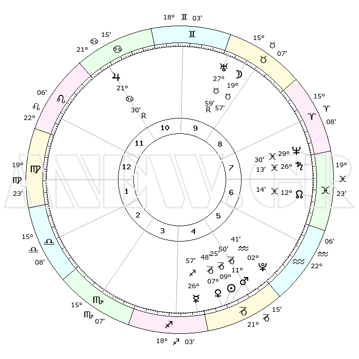 | | ΘΕΣΕΙΣ ΠΛΑΝΗΤΩΝ ΑΣΤΡΟΛΟΓΙΚΟΥ ΧΑΡΤΗ ΤΗΣ ΣΤΙΓΜΗΣ ΑΥΤΗΣ | | | | Πλανήτης | Ζώδιο | Μοίρες | Δεκαήμ. | Σε οίκο | Απόκλιση | | Ακμές των οίκων | | Ηλιος | Αιγόκερως | 09°20' | Πρώτο | 5 | 23 S 06 | | 1ος | 24°13' | Λέων | | Σελήνη | Ταύρος | 18°41' | Δεύτερο | 10 | 21 N 53 | | 2ος | 17°28' | Παρθένος | | Ερμής | Τοξότης | 26°49' | Τρίτο | 5 | 23 S 50 | | 3ος | 15°34' | Ζυγός | | Αφροδίτη | Αιγόκερως | 07°41' | Πρώτο | 5 | 23 S 40 | | 4ος | 18°23' | Σκορπιός | | Αρης | Αιγόκερως | 11°46' | Δεύτερο | 5 | 23 S 48 | | 5ος | 22°59' | Τοξότης | | Δίας | Καρκίνος | 21°31'R | Τρίτο | 11 | 21 N 57 | | 6ος | 25°27' | Αιγόκερως | | Κρόνος | Ιχθείς | 26°13' | Τρίτο | 8 | 03 S 35 | | 7ος | 24°13' | Υδροχόος | | Ουρανός | Ταύρος | 27°59'R | Τρίτο | 10 | 19 N 31 | | 8ος | 17°28' | Ιχθείς | | Ποσειδώνας | Ιχθείς | 29°30' | Τρίτο | 8 | 01 S 26 | | 9ος | 15°34' | Κριός | | Πλούτωνας | Υδροχόος | 02°41' | Πρώτο | 6 | 23 S 14 | | 10ος | 18°23' | Ταύρος | | Β. Δεσμός | Ιχθείς | 12°14' | Δεύτερο | 7 | 06 S 58 | | 11ος | 22°59' | Δίδυμοι | | Ωροσκόπος | Λέων | 24°13' | Τρίτο | | | 12ος | 25°27' | Καρκίνος | | Μεσουράνημα | Ταύρος | 18°23' | Δεύτερο | | | |
