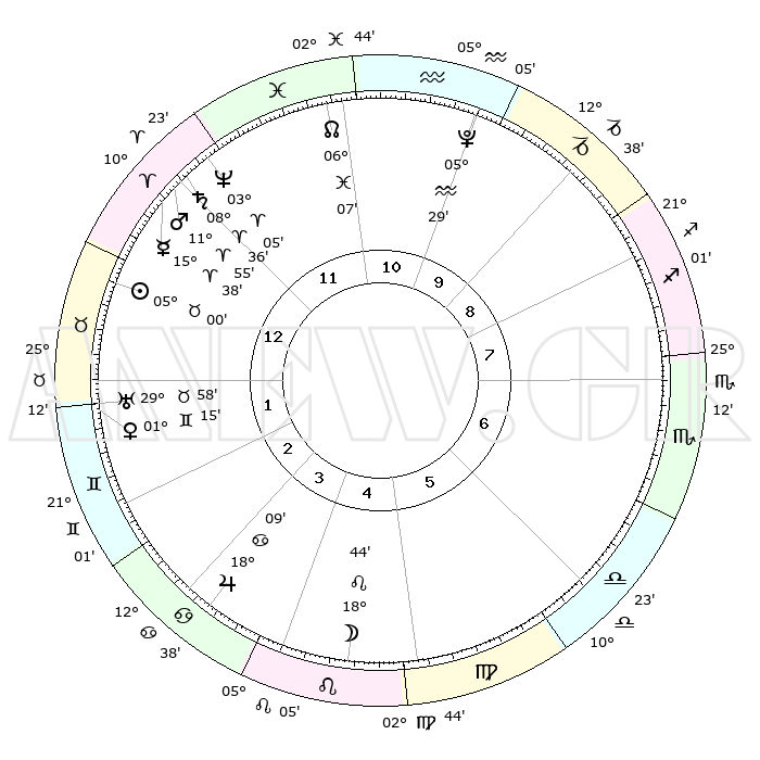 | | ΘΕΣΕΙΣ ΠΛΑΝΗΤΩΝ ΑΣΤΡΟΛΟΓΙΚΟΥ ΧΑΡΤΗ ΤΗΣ ΣΤΙΓΜΗΣ ΑΥΤΗΣ | | | | Πλανήτης | Ζώδιο | Μοίρες | Δεκαήμ. | Σε οίκο | Απόκλιση | | Ακμές των οίκων | | Ηλιος | Ταύρος | 04°53' | Πρώτο | 2 | 13 N 09 | | 1ος | 18°18' | Ιχθείς | | Σελήνη | Λέων | 17°05' | Δεύτερο | 6 | 17 N 24 | | 2ος | 01°09' | Ταύρος | | Ερμής | Κριός | 15°26' | Δεύτερο | 1 | 03 N 50 | | 3ος | 00°28' | Δίδυμοι | | Αφροδίτη | Δίδυμοι | 01°06' | Πρώτο | 3 | 21 N 00 | | 4ος | 23°24' | Δίδυμοι | | Αρης | Κριός | 11°50' | Δεύτερο | 1 | 03 N 49 | | 5ος | 15°17' | Καρκίνος | | Δίας | Καρκίνος | 18°08' | Δεύτερο | 5 | 22 N 35 | | 6ος | 11°01' | Λέων | | Κρόνος | Κριός | 08°35' | Πρώτο | 1 | 01 N 25 | | 7ος | 18°18' | Παρθένος | | Ουρανός | Ταύρος | 29°57' | Τρίτο | 2 | 19 N 58 | | 8ος | 01°09' | Σκορπιός | | Ποσειδώνας | Κριός | 03°04' | Πρώτο | 1 | 00 N 01 | | 9ος | 00°28' | Τοξότης | | Πλούτωνας | Υδροχόος | 05°29' | Πρώτο | 11 | 22 S 48 | | 10ος | 23°24' | Τοξότης | | Β. Δεσμός | Ιχθείς | 06°08' | Πρώτο | 12 | 09 S 16 | | 11ος | 15°17' | Αιγόκερως | | Ωροσκόπος | Ιχθείς | 18°18' | Δεύτερο | | | 12ος | 11°01' | Υδροχόος | | Μεσουράνημα | Τοξότης | 23°24' | Τρίτο | | | |