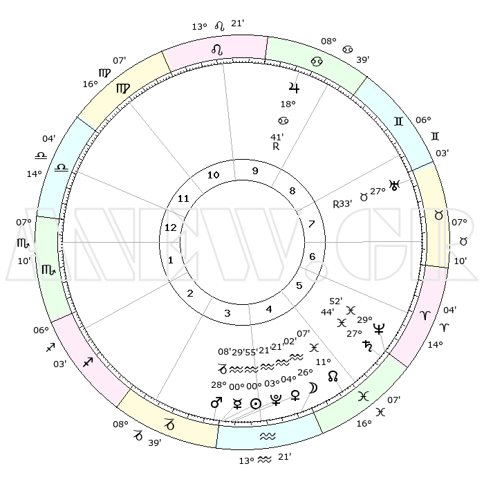 | | ΘΕΣΕΙΣ ΠΛΑΝΗΤΩΝ ΑΣΤΡΟΛΟΓΙΚΟΥ ΧΑΡΤΗ ΤΗΣ ΣΤΙΓΜΗΣ ΑΥΤΗΣ | | | | Πλανήτης | Ζώδιο | Μοίρες | Δεκαήμ. | Σε οίκο | Απόκλιση | | Ακμές των οίκων | | Ηλιος | Υδροχόος | 00°51' | Πρώτο | 4 | 19 S 58 | | 1ος | 16°31' | Ζυγός | | Σελήνη | Υδροχόος | 25°07' | Τρίτο | 5 | 14 S 21 | | 2ος | 14°09' | Σκορπιός | | Ερμής | Υδροχόος | 00°22' | Πρώτο | 4 | 22 S 03 | | 3ος | 15°16' | Τοξότης | | Αφροδίτη | Υδροχόος | 04°15' | Πρώτο | 4 | 20 S 18 | | 4ος | 18°42' | Αιγόκερως | | Αρης | Αιγόκερως | 28°05' | Τρίτο | 4 | 21 S 31 | | 5ος | 21°38' | Υδροχόος | | Δίας | Καρκίνος | 18°42'R | Δεύτερο | 10 | 22 N 25 | | 6ος | 21°18' | Ιχθείς | | Κρόνος | Ιχθείς | 27°44' | Τρίτο | 6 | 02 S 55 | | 7ος | 16°31' | Κριός | | Ουρανός | Ταύρος | 27°33'R | Τρίτο | 8 | 19 N 25 | | 8ος | 14°09' | Ταύρος | | Ποσειδώνας | Ιχθείς | 29°52' | Τρίτο | 6 | 01 S 16 | | 9ος | 15°16' | Δίδυμοι | | Πλούτωνας | Υδροχόος | 03°21' | Πρώτο | 4 | 23 S 05 | | 10ος | 18°42' | Καρκίνος | | Β. Δεσμός | Ιχθείς | 11°07' | Δεύτερο | 5 | 07 S 24 | | 11ος | 21°38' | Λέων | | Ωροσκόπος | Ζυγός | 16°31' | Δεύτερο | | | 12ος | 21°18' | Παρθένος | | Μεσουράνημα | Καρκίνος | 18°42' | Δεύτερο | | | |
