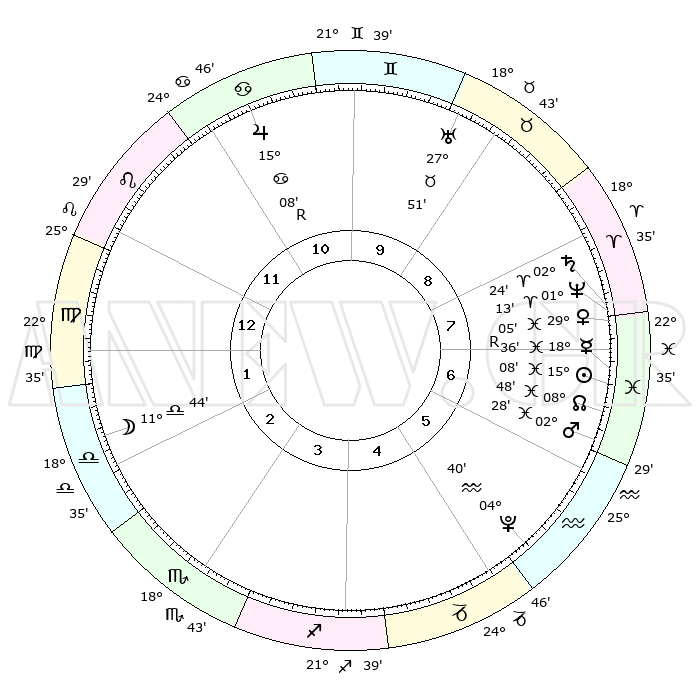 | | ΘΕΣΕΙΣ ΠΛΑΝΗΤΩΝ ΑΣΤΡΟΛΟΓΙΚΟΥ ΧΑΡΤΗ ΤΗΣ ΣΤΙΓΜΗΣ ΑΥΤΗΣ | | | | Πλανήτης | Ζώδιο | Μοίρες | Δεκαήμ. | Σε οίκο | Απόκλιση | | Ακμές των οίκων | | Ηλιος | Ιχθείς | 15°04' | Δεύτερο | 7 | 05 S 53 | | 1ος | 05°51' | Παρθένος | | Σελήνη | Ζυγός | 11°01' | Δεύτερο | 2 | 06 S 56 | | 2ος | 00°19' | Ζυγός | | Ερμής | Ιχθείς | 18°39'R | Δεύτερο | 7 | 01 S 06 | | 3ος | 29°29' | Ζυγός | | Αφροδίτη | Ιχθείς | 29°01' | Τρίτο | 7 | 01 S 34 | | 4ος | 02°26' | Τοξότης | | Αρης | Ιχθείς | 02°25' | Πρώτο | 6 | 11 S 38 | | 5ος | 06°15' | Αιγόκερως | | Δίας | Καρκίνος | 15°08'R | Δεύτερο | 11 | 22 N 55 | | 6ος | 07°47' | Υδροχόος | | Κρόνος | Κριός | 02°24' | Πρώτο | 8 | 01 S 00 | | 7ος | 05°51' | Ιχθείς | | Ουρανός | Ταύρος | 27°51' | Τρίτο | 9 | 19 N 30 | | 8ος | 00°19' | Κριός | | Ποσειδώνας | Κριός | 01°13' | Πρώτο | 8 | 00 S 43 | | 9ος | 29°29' | Κριός | | Πλούτωνας | Υδροχόος | 04°40' | Πρώτο | 5 | 22 S 51 | | 10ος | 02°26' | Δίδυμοι | | Β. Δεσμός | Ιχθείς | 08°48' | Πρώτο | 7 | 08 S 16 | | 11ος | 06°15' | Καρκίνος | | Ωροσκόπος | Παρθένος | 05°51' | Πρώτο | | | 12ος | 07°47' | Λέων | | Μεσουράνημα | Δίδυμοι | 02°26' | Πρώτο | | | |