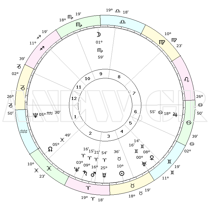| | ΘΕΣΕΙΣ ΠΛΑΝΗΤΩΝ ΑΣΤΡΟΛΟΓΙΚΟΥ ΧΑΡΤΗ ΤΗΣ ΣΤΙΓΜΗΣ ΑΥΤΗΣ | | | | Πλανήτης | Ζώδιο | Μοίρες | Δεκαήμ. | Σε οίκο | Απόκλιση | | Ακμές των οίκων | | Ηλιος | Ταύρος | 10°34' | Δεύτερο | 4 | 14 N 59 | | 1ος | 09°34' | Αιγόκερως | | Σελήνη | Σκορπιός | 01°26' | Πρώτο | 9 | 15 S 49 | | 2ος | 19°10' | Υδροχόος | | Ερμής | Κριός | 25°49' | Τρίτο | 3 | 08 N 10 | | 3ος | 29°28' | Ιχθείς | | Αφροδίτη | Δίδυμοι | 08°11' | Πρώτο | 5 | 22 N 33 | | 4ος | 01°43' | Ταύρος | | Αρης | Κριός | 16°19' | Δεύτερο | 3 | 05 N 36 | | 5ος | 26°37' | Ταύρος | | Δίας | Καρκίνος | 18°54' | Δεύτερο | 7 | 22 N 29 | | 6ος | 17°58' | Δίδυμοι | | Κρόνος | Κριός | 09°15' | Πρώτο | 3 | 01 N 40 | | 7ος | 09°34' | Καρκίνος | | Ουρανός | Δίδυμοι | 00°16' | Πρώτο | 5 | 20 N 02 | | 8ος | 19°10' | Λέων | | Ποσειδώνας | Κριός | 03°16' | Πρώτο | 3 | 00 N 05 | | 9ος | 29°28' | Παρθένος | | Πλούτωνας | Υδροχόος | 05°30' | Πρώτο | 1 | 22 S 49 | | 10ος | 01°43' | Σκορπιός | | Β. Δεσμός | Ιχθείς | 05°49' | Πρώτο | 2 | 09 S 23 | | 11ος | 26°37' | Σκορπιός | | Ωροσκόπος | Αιγόκερως | 09°34' | Πρώτο | | | 12ος | 17°58' | Τοξότης | | Μεσουράνημα | Σκορπιός | 01°43' | Πρώτο | | | |