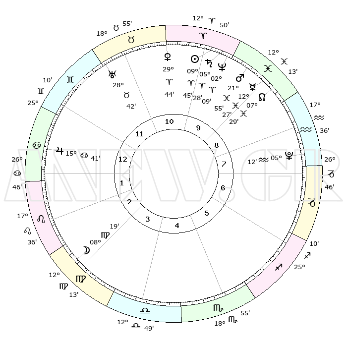 | | ΘΕΣΕΙΣ ΠΛΑΝΗΤΩΝ ΑΣΤΡΟΛΟΓΙΚΟΥ ΧΑΡΤΗ ΤΗΣ ΣΤΙΓΜΗΣ ΑΥΤΗΣ | | | | Πλανήτης | Ζώδιο | Μοίρες | Δεκαήμ. | Σε οίκο | Απόκλιση | | Ακμές των οίκων | | Ηλιος | Κριός | 09°40' | Πρώτο | 10 | 03 N 50 | | 1ος | 01°47' | Καρκίνος | | Σελήνη | Παρθένος | 07°15' | Πρώτο | 3 | 08 N 59 | | 2ος | 22°28' | Καρκίνος | | Ερμής | Ιχθείς | 12°24' | Δεύτερο | 10 | 07 S 52 | | 3ος | 14°24' | Λέων | | Αφροδίτη | Κριός | 29°38' | Τρίτο | 11 | 10 N 52 | | 4ος | 11°00' | Παρθένος | | Αρης | Ιχθείς | 21°51' | Τρίτο | 10 | 04 S 12 | | 5ος | 15°13' | Ζυγός | | Δίας | Καρκίνος | 15°41' | Δεύτερο | 1 | 22 N 53 | | 6ος | 25°05' | Σκορπιός | | Κρόνος | Κριός | 05°27' | Πρώτο | 10 | 00 N 13 | | 7ος | 01°47' | Αιγόκερως | | Ουρανός | Ταύρος | 28°42' | Τρίτο | 12 | 19 N 42 | | 8ος | 22°29' | Αιγόκερως | | Ποσειδώνας | Κριός | 02°09' | Πρώτο | 10 | 00 S 21 | | 9ος | 14°24' | Υδροχόος | | Πλούτωνας | Υδροχόος | 05°11' | Πρώτο | 8 | 22 S 48 | | 10ος | 11°00' | Ιχθείς | | Β. Δεσμός | Ιχθείς | 07°29' | Πρώτο | 9 | 08 S 45 | | 11ος | 15°13' | Κριός | | Ωροσκόπος | Καρκίνος | 01°47' | Πρώτο | | | 12ος | 25°05' | Ταύρος | | Μεσουράνημα | Ιχθείς | 11°00' | Δεύτερο | | | |