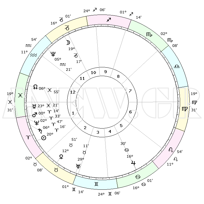 | | ΘΕΣΕΙΣ ΠΛΑΝΗΤΩΝ ΑΣΤΡΟΛΟΓΙΚΟΥ ΧΑΡΤΗ ΤΗΣ ΣΤΙΓΜΗΣ ΑΥΤΗΣ | | | | Πλανήτης | Ζώδιο | Μοίρες | Δεκαήμ. | Σε οίκο | Απόκλιση | | Ακμές των οίκων | | Ηλιος | Κριός | 20°11' | Τρίτο | 2 | 07 N 53 | | 1ος | 05°19' | Υδροχόος | | Σελήνη | Αιγόκερως | 18°16' | Δεύτερο | 12 | 26 S 06 | | 2ος | 20°11' | Ιχθείς | | Ερμής | Ιχθείς | 23°14' | Τρίτο | 2 | 04 S 50 | | 3ος | 27°45' | Κριός | | Αφροδίτη | Ταύρος | 12°45' | Δεύτερο | 3 | 15 N 36 | | 4ος | 25°19' | Ταύρος | | Αρης | Κριός | 00°11'R | Πρώτο | 2 | 00 S 51 | | 5ος | 17°44' | Δίδυμοι | | Δίας | Καρκίνος | 16°29' | Δεύτερο | 6 | 22 N 47 | | 6ος | 09°23' | Καρκίνος | | Κρόνος | Κριός | 06°47' | Πρώτο | 2 | 00 N 44 | | 7ος | 05°19' | Λέων | | Ουρανός | Ταύρος | 29°11' | Τρίτο | 4 | 19 N 48 | | 8ος | 20°11' | Παρθένος | | Ποσειδώνας | Κριός | 02°33' | Πρώτο | 2 | 00 S 11 | | 9ος | 27°45' | Ζυγός | | Πλούτωνας | Υδροχόος | 05°21' | Πρώτο | 1 | 22 S 47 | | 10ος | 25°19' | Σκορπιός | | Β. Δεσμός | Ιχθείς | 06°56' | Πρώτο | 1 | 08 S 58 | | 11ος | 17°44' | Τοξότης | | Ωροσκόπος | Υδροχόος | 05°19' | Πρώτο | | | 12ος | 09°23' | Αιγόκερως | | Μεσουράνημα | Σκορπιός | 25°19' | Τρίτο | | | |