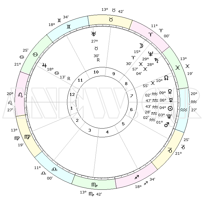 | | ΘΕΣΕΙΣ ΠΛΑΝΗΤΩΝ ΑΣΤΡΟΛΟΓΙΚΟΥ ΧΑΡΤΗ ΤΗΣ ΣΤΙΓΜΗΣ ΑΥΤΗΣ | | | | Πλανήτης | Ζώδιο | Μοίρες | Δεκαήμ. | Σε οίκο | Απόκλιση | | Ακμές των οίκων | | Ηλιος | Υδροχόος | 04°38' | Πρώτο | 7 | 19 S 06 | | 1ος | 28°53' | Καρκίνος | | Σελήνη | Κριός | 14°29' | Δεύτερο | 9 | 08 N 28 | | 2ος | 19°51' | Λέων | | Ερμής | Υδροχόος | 06°40' | Πρώτο | 7 | 20 S 37 | | 3ος | 14°45' | Παρθένος | | Αφροδίτη | Υδροχόος | 08°56' | Πρώτο | 7 | 19 S 12 | | 4ος | 15°39' | Ζυγός | | Αρης | Υδροχόος | 00°59' | Πρώτο | 7 | 20 S 56 | | 5ος | 21°43' | Σκορπιός | | Δίας | Καρκίνος | 18°14'R | Δεύτερο | 12 | 22 N 29 | | 6ος | 27°36' | Τοξότης | | Κρόνος | Ιχθείς | 28°04' | Τρίτο | 9 | 02 S 47 | | 7ος | 28°53' | Αιγόκερως | | Ουρανός | Ταύρος | 27°30'R | Τρίτο | 11 | 19 N 25 | | 8ος | 19°51' | Υδροχόος | | Ποσειδώνας | Ιχθείς | 29°57' | Τρίτο | 9 | 01 S 14 | | 9ος | 14°45' | Ιχθείς | | Πλούτωνας | Υδροχόος | 03°28' | Πρώτο | 7 | 23 S 04 | | 10ος | 15°39' | Κριός | | Β. Δεσμός | Ιχθείς | 10°55' | Δεύτερο | 8 | 07 S 28 | | 11ος | 21°43' | Ταύρος | | Ωροσκόπος | Καρκίνος | 28°53' | Τρίτο | | | 12ος | 27°36' | Δίδυμοι | | Μεσουράνημα | Κριός | 15°39' | Δεύτερο | | | |