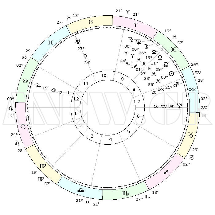 | | ΘΕΣΕΙΣ ΠΛΑΝΗΤΩΝ ΑΣΤΡΟΛΟΓΙΚΟΥ ΧΑΡΤΗ ΤΗΣ ΣΤΙΓΜΗΣ ΑΥΤΗΣ | | | | Πλανήτης | Ζώδιο | Μοίρες | Δεκαήμ. | Σε οίκο | Απόκλιση | | Ακμές των οίκων | | Ηλιος | Ιχθείς | 00°51' | Πρώτο | 9 | 11 S 10 | | 1ος | 11°39' | Καρκίνος | | Σελήνη | Ιχθείς | 25°40' | Τρίτο | 10 | 00 S 19 | | 2ος | 02°04' | Λέων | | Ερμής | Ιχθείς | 18°56' | Δεύτερο | 9 | 03 S 21 | | 3ος | 24°51' | Λέων | | Αφροδίτη | Ιχθείς | 11°22' | Δεύτερο | 9 | 08 S 39 | | 4ος | 23°06' | Παρθένος | | Αρης | Υδροχόος | 21°16' | Τρίτο | 8 | 15 S 26 | | 5ος | 28°32' | Ζυγός | | Δίας | Καρκίνος | 15°43'R | Δεύτερο | 1 | 22 N 50 | | 6ος | 07°15' | Τοξότης | | Κρόνος | Κριός | 00°44' | Πρώτο | 10 | 01 S 41 | | 7ος | 11°39' | Αιγόκερως | | Ουρανός | Ταύρος | 27°34' | Τρίτο | 11 | 19 N 26 | | 8ος | 02°04' | Υδροχόος | | Ποσειδώνας | Κριός | 00°43' | Πρώτο | 10 | 00 S 55 | | 9ος | 24°51' | Υδροχόος | | Πλούτωνας | Υδροχόος | 04°16' | Πρώτο | 8 | 22 S 55 | | 10ος | 23°06' | Ιχθείς | | Β. Δεσμός | Ιχθείς | 09°33' | Πρώτο | 9 | 07 S 59 | | 11ος | 28°32' | Κριός | | Ωροσκόπος | Καρκίνος | 11°39' | Δεύτερο | | | 12ος | 07°15' | Δίδυμοι | | Μεσουράνημα | Ιχθείς | 23°06' | Τρίτο | | | |