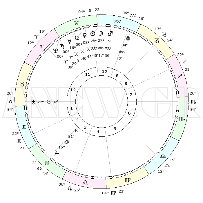 | | ΘΕΣΕΙΣ ΠΛΑΝΗΤΩΝ ΑΣΤΡΟΛΟΓΙΚΟΥ ΧΑΡΤΗ ΤΗΣ ΣΤΙΓΜΗΣ ΑΥΤΗΣ | | | | Πλανήτης | Ζώδιο | Μοίρες | Δεκαήμ. | Σε οίκο | Απόκλιση | | Ακμές των οίκων | | Ηλιος | Υδροχόος | 28°38' | Τρίτο | 11 | 11 S 57 | | 1ος | 16°36' | Κριός | | Σελήνη | Υδροχόος | 26°14' | Τρίτο | 11 | 13 S 52 | | 2ος | 22°33' | Ταύρος | | Ερμής | Ιχθείς | 16°25' | Δεύτερο | 12 | 04 S 50 | | 3ος | 17°38' | Δίδυμοι | | Αφροδίτη | Ιχθείς | 08°37' | Πρώτο | 12 | 09 S 42 | | 4ος | 09°25' | Καρκίνος | | Αρης | Υδροχόος | 19°32' | Δεύτερο | 11 | 15 S 59 | | 5ος | 02°41' | Λέων | | Δίας | Καρκίνος | 15°51'R | Δεύτερο | 4 | 22 N 49 | | 6ος | 02°51' | Παρθένος | | Κρόνος | Κριός | 00°29' | Πρώτο | 12 | 01 S 47 | | 7ος | 16°36' | Ζυγός | | Ουρανός | Ταύρος | 27°32' | Τρίτο | 2 | 19 N 26 | | 8ος | 22°33' | Σκορπιός | | Ποσειδώνας | Κριός | 00°39' | Πρώτο | 12 | 00 S 57 | | 9ος | 17°38' | Τοξότης | | Πλούτωνας | Υδροχόος | 04°12' | Πρώτο | 11 | 22 S 56 | | 10ος | 09°25' | Αιγόκερως | | Β. Δεσμός | Ιχθείς | 09°40' | Πρώτο | 12 | 07 S 57 | | 11ος | 02°41' | Υδροχόος | | Ωροσκόπος | Κριός | 16°36' | Δεύτερο | | | 12ος | 02°51' | Ιχθείς | | Μεσουράνημα | Αιγόκερως | 09°25' | Πρώτο | | | |
