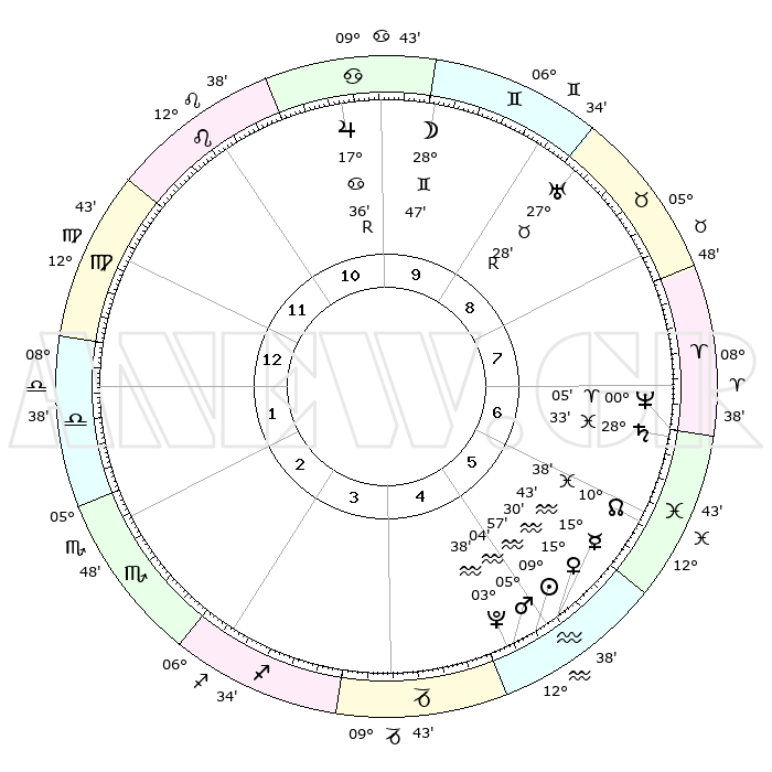 | | ΘΕΣΕΙΣ ΠΛΑΝΗΤΩΝ ΑΣΤΡΟΛΟΓΙΚΟΥ ΧΑΡΤΗ ΤΗΣ ΣΤΙΓΜΗΣ ΑΥΤΗΣ | | | | Πλανήτης | Ζώδιο | Μοίρες | Δεκαήμ. | Σε οίκο | Απόκλιση | | Ακμές των οίκων | | Ηλιος | Υδροχόος | 09°53' | Πρώτο | 5 | 17 S 46 | | 1ος | 18°46' | Παρθένος | | Σελήνη | Δίδυμοι | 27°48' | Τρίτο | 10 | 28 N 21 | | 2ος | 14°27' | Ζυγός | | Ερμής | Υδροχόος | 15°36' | Δεύτερο | 5 | 18 S 04 | | 3ος | 14°25' | Σκορπιός | | Αφροδίτη | Υδροχόος | 15°25' | Δεύτερο | 5 | 17 S 29 | | 4ος | 17°21' | Τοξότης | | Αρης | Υδροχόος | 05°00' | Πρώτο | 5 | 20 S 01 | | 5ος | 20°34' | Αιγόκερως | | Δίας | Καρκίνος | 17°36'R | Δεύτερο | 10 | 22 N 34 | | 6ος | 21°26' | Υδροχόος | | Κρόνος | Ιχθείς | 28°32' | Τρίτο | 7 | 02 S 35 | | 7ος | 18°46' | Ιχθείς | | Ουρανός | Ταύρος | 27°28'R | Τρίτο | 9 | 19 N 24 | | 8ος | 14°27' | Κριός | | Ποσειδώνας | Κριός | 00°05' | Πρώτο | 7 | 01 S 11 | | 9ος | 14°25' | Ταύρος | | Πλούτωνας | Υδροχόος | 03°38' | Πρώτο | 5 | 23 S 02 | | 10ος | 17°21' | Δίδυμοι | | Β. Δεσμός | Ιχθείς | 10°39' | Δεύτερο | 6 | 07 S 34 | | 11ος | 20°34' | Καρκίνος | | Ωροσκόπος | Παρθένος | 18°46' | Δεύτερο | | | 12ος | 21°26' | Λέων | | Μεσουράνημα | Δίδυμοι | 17°21' | Δεύτερο | | | |
