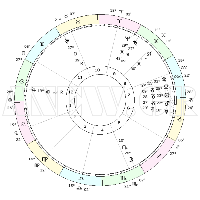 | | ΘΕΣΕΙΣ ΠΛΑΝΗΤΩΝ ΑΣΤΡΟΛΟΓΙΚΟΥ ΧΑΡΤΗ ΤΗΣ ΣΤΙΓΜΗΣ ΑΥΤΗΣ | | | | Πλανήτης | Ζώδιο | Μοίρες | Δεκαήμ. | Σε οίκο | Απόκλιση | | Ακμές των οίκων | | Ηλιος | Αιγόκερως | 23°23' | Τρίτο | 7 | 21 S 24 | | 1ος | 03°11' | Καρκίνος | | Σελήνη | Σκορπιός | 25°11' | Τρίτο | 5 | 23 S 51 | | 2ος | 23°48' | Καρκίνος | | Ερμής | Αιγόκερως | 18°21' | Δεύτερο | 7 | 23 S 51 | | 3ος | 15°50' | Λέων | | Αφροδίτη | Αιγόκερως | 25°02' | Τρίτο | 8 | 22 S 02 | | 4ος | 12°40' | Παρθένος | | Αρης | Αιγόκερως | 22°23' | Τρίτο | 7 | 22 S 31 | | 5ος | 17°05' | Ζυγός | | Δίας | Καρκίνος | 19°40'R | Δεύτερο | 1 | 22 N 15 | | 6ος | 26°49' | Σκορπιός | | Κρόνος | Ιχθείς | 27°08' | Τρίτο | 10 | 03 S 11 | | 7ος | 03°11' | Αιγόκερως | | Ουρανός | Ταύρος | 27°39'R | Τρίτο | 12 | 19 N 27 | | 8ος | 23°48' | Αιγόκερως | | Ποσειδώνας | Ιχθείς | 29°42' | Τρίτο | 10 | 01 S 20 | | 9ος | 15°50' | Υδροχόος | | Πλούτωνας | Υδροχόος | 03°07' | Πρώτο | 8 | 23 S 08 | | 10ος | 12°40' | Ιχθείς | | Β. Δεσμός | Ιχθείς | 11°30' | Δεύτερο | 9 | 07 S 15 | | 11ος | 17°05' | Κριός | | Ωροσκόπος | Καρκίνος | 03°11' | Πρώτο | | | 12ος | 26°49' | Ταύρος | | Μεσουράνημα | Ιχθείς | 12°40' | Δεύτερο | | | |