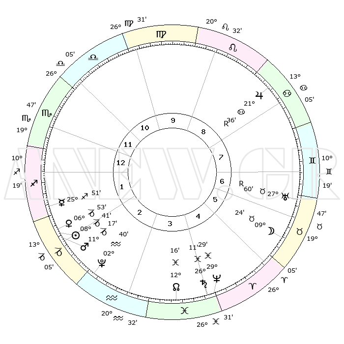 | | ΘΕΣΕΙΣ ΠΛΑΝΗΤΩΝ ΑΣΤΡΟΛΟΓΙΚΟΥ ΧΑΡΤΗ ΤΗΣ ΣΤΙΓΜΗΣ ΑΥΤΗΣ | | | | Πλανήτης | Ζώδιο | Μοίρες | Δεκαήμ. | Σε οίκο | Απόκλιση | | Ακμές των οίκων | | Ηλιος | Αιγόκερως | 08°36' | Πρώτο | 2 | 23 S 09 | | 1ος | 17°32' | Σκορπιός | | Σελήνη | Ταύρος | 08°16' | Πρώτο | 6 | 18 N 17 | | 2ος | 17°14' | Τοξότης | | Ερμής | Τοξότης | 25°44' | Τρίτο | 2 | 23 S 43 | | 3ος | 21°03' | Αιγόκερως | | Αφροδίτη | Αιγόκερως | 06°48' | Πρώτο | 2 | 23 S 41 | | 4ος | 26°30' | Υδροχόος | | Αρης | Αιγόκερως | 11°13' | Δεύτερο | 2 | 23 S 50 | | 5ος | 28°45' | Ιχθείς | | Δίας | Καρκίνος | 21°36'R | Τρίτο | 9 | 21 N 56 | | 6ος | 25°28' | Κριός | | Κρόνος | Ιχθείς | 26°11' | Τρίτο | 4 | 03 S 36 | | 7ος | 17°32' | Ταύρος | | Ουρανός | Ταύρος | 27°60'R | Τρίτο | 7 | 19 N 31 | | 8ος | 17°14' | Δίδυμοι | | Ποσειδώνας | Ιχθείς | 29°29' | Τρίτο | 5 | 01 S 26 | | 9ος | 21°03' | Καρκίνος | | Πλούτωνας | Υδροχόος | 02°40' | Πρώτο | 3 | 23 S 14 | | 10ος | 26°30' | Λέων | | Β. Δεσμός | Ιχθείς | 12°16' | Δεύτερο | 4 | 06 S 57 | | 11ος | 28°45' | Παρθένος | | Ωροσκόπος | Σκορπιός | 17°32' | Δεύτερο | | | 12ος | 25°28' | Ζυγός | | Μεσουράνημα | Λέων | 26°30' | Τρίτο | | | |
