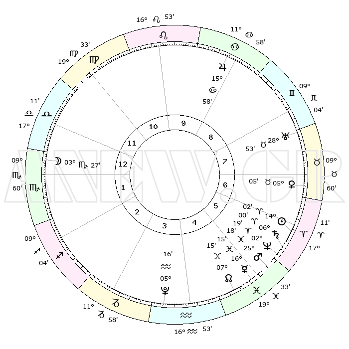 | | ΘΕΣΕΙΣ ΠΛΑΝΗΤΩΝ ΑΣΤΡΟΛΟΓΙΚΟΥ ΧΑΡΤΗ ΤΗΣ ΣΤΙΓΜΗΣ ΑΥΤΗΣ | | | | Πλανήτης | Ζώδιο | Μοίρες | Δεκαήμ. | Σε οίκο | Απόκλιση | | Ακμές των οίκων | | Ηλιος | Κριός | 13°58' | Δεύτερο | 6 | 05 N 30 | | 1ος | 18°09' | Ζυγός | | Σελήνη | Σκορπιός | 02°32' | Πρώτο | 1 | 16 S 17 | | 2ος | 15°53' | Σκορπιός | | Ερμής | Ιχθείς | 16°11' | Δεύτερο | 5 | 07 S 01 | | 3ος | 17°05' | Τοξότης | | Αφροδίτη | Ταύρος | 04°59' | Πρώτο | 7 | 12 N 52 | | 4ος | 20°35' | Αιγόκερως | | Αρης | Ιχθείς | 25°15' | Τρίτο | 6 | 02 S 50 | | 5ος | 23°31' | Υδροχόος | | Δίας | Καρκίνος | 15°58' | Δεύτερο | 9 | 22 N 51 | | 6ος | 23°06' | Ιχθείς | | Κρόνος | Κριός | 05°60' | Πρώτο | 6 | 00 N 25 | | 7ος | 18°09' | Κριός | | Ουρανός | Ταύρος | 28°53' | Τρίτο | 8 | 19 N 44 | | 8ος | 15°53' | Ταύρος | | Ποσειδώνας | Κριός | 02°19' | Πρώτο | 6 | 00 S 17 | | 9ος | 17°05' | Δίδυμοι | | Πλούτωνας | Υδροχόος | 05°16' | Πρώτο | 4 | 22 S 47 | | 10ος | 20°35' | Καρκίνος | | Β. Δεσμός | Ιχθείς | 07°16' | Πρώτο | 5 | 08 S 51 | | 11ος | 23°32' | Λέων | | Ωροσκόπος | Ζυγός | 18°09' | Δεύτερο | | | 12ος | 23°06' | Παρθένος | | Μεσουράνημα | Καρκίνος | 20°35' | Τρίτο | | | |