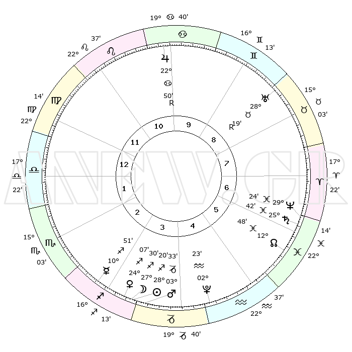 | | ΘΕΣΕΙΣ ΠΛΑΝΗΤΩΝ ΑΣΤΡΟΛΟΓΙΚΟΥ ΧΑΡΤΗ ΤΗΣ ΣΤΙΓΜΗΣ ΑΥΤΗΣ | | | | Πλανήτης | Ζώδιο | Μοίρες | Δεκαήμ. | Σε οίκο | Απόκλιση | | Ακμές των οίκων | | Ηλιος | Τοξότης | 27°14' | Τρίτο | 4 | 23 S 24 | | 1ος | 18°57' | Παρθένος | | Σελήνη | Τοξότης | 14°23' | Δεύτερο | 3 | 27 S 29 | | 2ος | 14°39' | Ζυγός | | Ερμής | Τοξότης | 09°18' | Πρώτο | 3 | 20 S 49 | | 3ος | 14°37' | Σκορπιός | | Αφροδίτη | Τοξότης | 22°44' | Τρίτο | 4 | 23 S 14 | | 4ος | 17°33' | Τοξότης | | Αρης | Αιγόκερως | 02°43' | Πρώτο | 4 | 24 S 12 | | 5ος | 20°46' | Αιγόκερως | | Δίας | Καρκίνος | 22°57'R | Τρίτο | 11 | 21 N 41 | | 6ος | 21°38' | Υδροχόος | | Κρόνος | Ιχθείς | 25°40' | Τρίτο | 7 | 03 S 50 | | 7ος | 18°57' | Ιχθείς | | Ουρανός | Ταύρος | 28°21'R | Τρίτο | 9 | 19 N 36 | | 8ος | 14°39' | Κριός | | Ποσειδώνας | Ιχθείς | 29°24' | Τρίτο | 7 | 01 S 28 | | 9ος | 14°37' | Ταύρος | | Πλούτωνας | Υδροχόος | 02°21' | Πρώτο | 5 | 23 S 18 | | 10ος | 17°33' | Δίδυμοι | | Β. Δεσμός | Ιχθείς | 12°52' | Δεύτερο | 6 | 06 S 44 | | 11ος | 20°46' | Καρκίνος | | Ωροσκόπος | Παρθένος | 18°57' | Δεύτερο | | | 12ος | 21°38' | Λέων | | Μεσουράνημα | Δίδυμοι | 17°33' | Δεύτερο | | | |