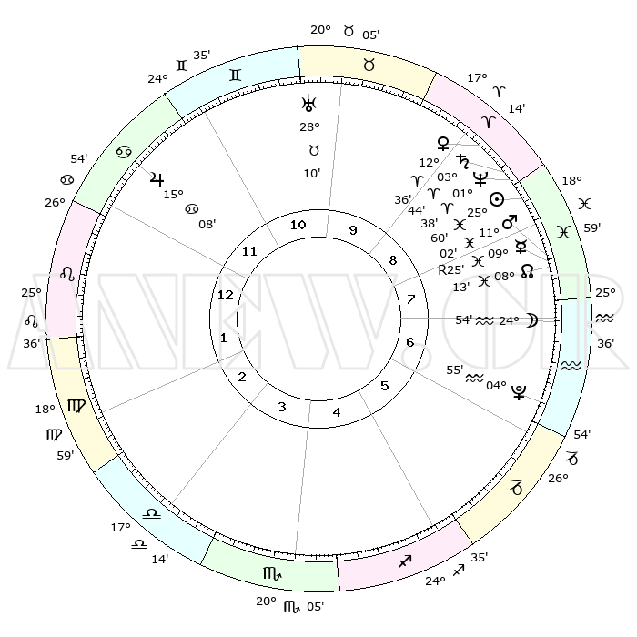 | | ΘΕΣΕΙΣ ΠΛΑΝΗΤΩΝ ΑΣΤΡΟΛΟΓΙΚΟΥ ΧΑΡΤΗ ΤΗΣ ΣΤΙΓΜΗΣ ΑΥΤΗΣ | | | | Πλανήτης | Ζώδιο | Μοίρες | Δεκαήμ. | Σε οίκο | Απόκλιση | | Ακμές των οίκων | | Ηλιος | Ιχθείς | 25°56' | Τρίτο | 8 | 01 S 37 | | 1ος | 09°30' | Λέων | | Σελήνη | Υδροχόος | 24°10' | Τρίτο | 7 | 14 S 44 | | 2ος | 01°18' | Παρθένος | | Ερμής | Ιχθείς | 09°26'R | Πρώτο | 8 | 06 S 08 | | 3ος | 27°38' | Παρθένος | | Αφροδίτη | Κριός | 12°32' | Δεύτερο | 9 | 04 N 02 | | 4ος | 29°39' | Ζυγός | | Αρης | Ιχθείς | 10°59' | Δεύτερο | 8 | 08 S 27 | | 5ος | 05°17' | Τοξότης | | Δίας | Καρκίνος | 15°08' | Δεύτερο | 12 | 22 N 56 | | 6ος | 09°31' | Αιγόκερως | | Κρόνος | Κριός | 03°44' | Πρώτο | 9 | 00 S 28 | | 7ος | 09°30' | Υδροχόος | | Ουρανός | Ταύρος | 28°10' | Τρίτο | 10 | 19 N 35 | | 8ος | 01°18' | Ιχθείς | | Ποσειδώνας | Κριός | 01°37' | Πρώτο | 9 | 00 S 33 | | 9ος | 27°38' | Ιχθείς | | Πλούτωνας | Υδροχόος | 04°55' | Πρώτο | 6 | 22 S 49 | | 10ος | 29°39' | Κριός | | Β. Δεσμός | Ιχθείς | 08°13' | Πρώτο | 8 | 08 S 29 | | 11ος | 05°17' | Δίδυμοι | | Ωροσκόπος | Λέων | 09°30' | Πρώτο | | | 12ος | 09°31' | Καρκίνος | | Μεσουράνημα | Κριός | 29°39' | Τρίτο | | | |