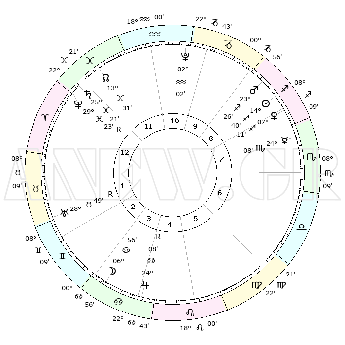 | | ΘΕΣΕΙΣ ΠΛΑΝΗΤΩΝ ΑΣΤΡΟΛΟΓΙΚΟΥ ΧΑΡΤΗ ΤΗΣ ΣΤΙΓΜΗΣ ΑΥΤΗΣ | | | | Πλανήτης | Ζώδιο | Μοίρες | Δεκαήμ. | Σε οίκο | Απόκλιση | | Ακμές των οίκων | | Ηλιος | Τοξότης | 14°35' | Δεύτερο | 9 | 22 S 33 | | 1ος | 23°23' | Ιχθείς | | Σελήνη | Καρκίνος | 05°45' | Πρώτο | 4 | 27 N 56 | | 2ος | 05°12' | Ταύρος | | Ερμής | Σκορπιός | 24°04' | Τρίτο | 8 | 16 S 25 | | 3ος | 03°39' | Δίδυμοι | | Αφροδίτη | Τοξότης | 07°05' | Πρώτο | 9 | 21 S 00 | | 4ος | 26°17' | Δίδυμοι | | Αρης | Τοξότης | 23°22' | Τρίτο | 9 | 23 S 58 | | 5ος | 18°20' | Καρκίνος | | Δίας | Καρκίνος | 24°09'R | Τρίτο | 5 | 21 N 27 | | 6ος | 14°45' | Λέων | | Κρόνος | Ιχθείς | 25°21' | Τρίτο | 1 | 04 S 00 | | 7ος | 23°23' | Παρθένος | | Ουρανός | Ταύρος | 28°49'R | Τρίτο | 2 | 19 N 42 | | 8ος | 05°12' | Σκορπιός | | Ποσειδώνας | Ιχθείς | 29°23'R | Τρίτο | 1 | 01 S 29 | | 9ος | 03°39' | Τοξότης | | Πλούτωνας | Υδροχόος | 02°02' | Πρώτο | 11 | 23 S 22 | | 10ος | 26°17' | Τοξότης | | Β. Δεσμός | Ιχθείς | 13°31' | Δεύτερο | 12 | 06 S 29 | | 11ος | 18°20' | Αιγόκερως | | Ωροσκόπος | Ιχθείς | 23°23' | Τρίτο | | | 12ος | 14°45' | Υδροχόος | | Μεσουράνημα | Τοξότης | 26°17' | Τρίτο | | | |