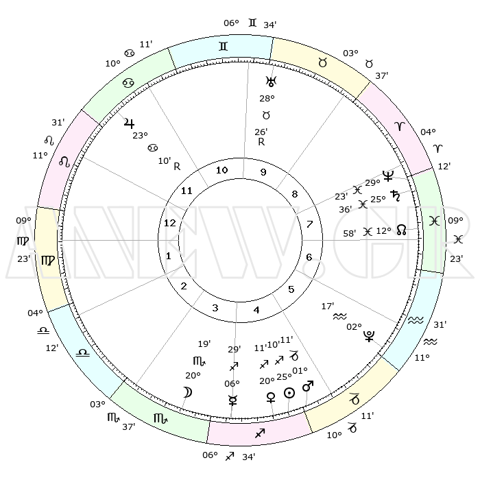 | | ΘΕΣΕΙΣ ΠΛΑΝΗΤΩΝ ΑΣΤΡΟΛΟΓΙΚΟΥ ΧΑΡΤΗ ΤΗΣ ΣΤΙΓΜΗΣ ΑΥΤΗΣ | | | | Πλανήτης | Ζώδιο | Μοίρες | Δεκαήμ. | Σε οίκο | Απόκλιση | | Ακμές των οίκων | | Ηλιος | Τοξότης | 24°48' | Τρίτο | 8 | 23 S 20 | | 1ος | 13°08' | Ταύρος | | Σελήνη | Σκορπιός | 16°10' | Δεύτερο | 7 | 20 S 57 | | 2ος | 11°50' | Δίδυμοι | | Ερμής | Τοξότης | 05°60' | Πρώτο | 7 | 19 S 59 | | 3ος | 04°13' | Καρκίνος | | Αφροδίτη | Τοξότης | 19°44' | Δεύτερο | 8 | 22 S 56 | | 4ος | 26°07' | Καρκίνος | | Αρης | Αιγόκερως | 00°55' | Πρώτο | 8 | 24 S 13 | | 5ος | 22°01' | Λέων | | Δίας | Καρκίνος | 23°12'R | Τρίτο | 3 | 21 N 38 | | 6ος | 27°22' | Παρθένος | | Κρόνος | Ιχθείς | 25°35' | Τρίτο | 11 | 03 S 53 | | 7ος | 13°08' | Σκορπιός | | Ουρανός | Ταύρος | 28°26'R | Τρίτο | 1 | 19 N 37 | | 8ος | 11°50' | Τοξότης | | Ποσειδώνας | Ιχθείς | 29°23' | Τρίτο | 12 | 01 S 29 | | 9ος | 04°13' | Αιγόκερως | | Πλούτωνας | Υδροχόος | 02°17' | Πρώτο | 10 | 23 S 19 | | 10ος | 26°07' | Αιγόκερως | | Β. Δεσμός | Ιχθείς | 12°59' | Δεύτερο | 11 | 06 S 41 | | 11ος | 22°01' | Υδροχόος | | Ωροσκόπος | Ταύρος | 13°08' | Δεύτερο | | | 12ος | 27°22' | Ιχθείς | | Μεσουράνημα | Αιγόκερως | 26°07' | Τρίτο | | | |