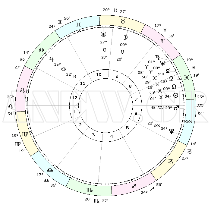 | | ΘΕΣΕΙΣ ΠΛΑΝΗΤΩΝ ΑΣΤΡΟΛΟΓΙΚΟΥ ΧΑΡΤΗ ΤΗΣ ΣΤΙΓΜΗΣ ΑΥΤΗΣ | | | | Πλανήτης | Ζώδιο | Μοίρες | Δεκαήμ. | Σε οίκο | Απόκλιση | | Ακμές των οίκων | | Ηλιος | Ιχθείς | 03°56' | Πρώτο | 8 | 10 S 04 | | 1ος | 03°21' | Λέων | | Σελήνη | Ταύρος | 08°14' | Πρώτο | 10 | 18 N 33 | | 2ος | 24°38' | Λέων | | Ερμής | Ιχθείς | 21°27' | Τρίτο | 9 | 01 S 38 | | 3ος | 20°08' | Παρθένος | | Αφροδίτη | Ιχθείς | 15°12' | Δεύτερο | 8 | 07 S 09 | | 4ος | 21°34' | Ζυγός | | Αρης | Υδροχόος | 23°41' | Τρίτο | 7 | 14 S 39 | | 5ος | 27°31' | Σκορπιός | | Δίας | Καρκίνος | 15°32'R | Δεύτερο | 12 | 22 N 52 | | 6ος | 02°40' | Αιγόκερως | | Κρόνος | Κριός | 01°05' | Πρώτο | 9 | 01 S 32 | | 7ος | 03°21' | Υδροχόος | | Ουρανός | Ταύρος | 27°37' | Τρίτο | 11 | 19 N 27 | | 8ος | 24°38' | Υδροχόος | | Ποσειδώνας | Κριός | 00°49' | Πρώτο | 9 | 00 S 52 | | 9ος | 20°08' | Ιχθείς | | Πλούτωνας | Υδροχόος | 04°21' | Πρώτο | 7 | 22 S 54 | | 10ος | 21°34' | Κριός | | Β. Δεσμός | Ιχθείς | 09°23' | Πρώτο | 8 | 08 S 03 | | 11ος | 27°31' | Ταύρος | | Ωροσκόπος | Λέων | 03°21' | Πρώτο | | | 12ος | 02°40' | Καρκίνος | | Μεσουράνημα | Κριός | 21°34' | Τρίτο | | | |