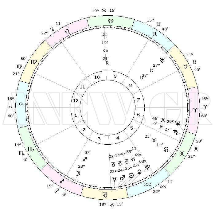 | | ΘΕΣΕΙΣ ΠΛΑΝΗΤΩΝ ΑΣΤΡΟΛΟΓΙΚΟΥ ΧΑΡΤΗ ΤΗΣ ΣΤΙΓΜΗΣ ΑΥΤΗΣ | | | | Πλανήτης | Ζώδιο | Μοίρες | Δεκαήμ. | Σε οίκο | Απόκλιση | | Ακμές των οίκων | | Ηλιος | Αιγόκερως | 25°43' | Τρίτο | 4 | 21 S 00 | | 1ος | 27°34' | Παρθένος | | Σελήνη | Τοξότης | 22°20' | Τρίτο | 3 | 28 S 13 | | 2ος | 23°58' | Ζυγός | | Ερμής | Αιγόκερως | 22°02' | Τρίτο | 4 | 23 S 26 | | 3ος | 24°18' | Σκορπιός | | Αφροδίτη | Αιγόκερως | 27°54' | Τρίτο | 4 | 21 S 33 | | 4ος | 27°16' | Τοξότης | | Αρης | Αιγόκερως | 24°09' | Τρίτο | 4 | 22 S 14 | | 5ος | 00°16' | Υδροχόος | | Δίας | Καρκίνος | 19°22'R | Δεύτερο | 10 | 22 N 18 | | 6ος | 00°48' | Ιχθείς | | Κρόνος | Ιχθείς | 27°19' | Τρίτο | 6 | 03 S 06 | | 7ος | 27°34' | Ιχθείς | | Ουρανός | Ταύρος | 27°37'R | Τρίτο | 9 | 19 N 26 | | 8ος | 23°58' | Κριός | | Ποσειδώνας | Ιχθείς | 29°45' | Τρίτο | 7 | 01 S 19 | | 9ος | 24°18' | Ταύρος | | Πλούτωνας | Υδροχόος | 03°11' | Πρώτο | 5 | 23 S 07 | | 10ος | 27°16' | Δίδυμοι | | Β. Δεσμός | Ιχθείς | 11°23' | Δεύτερο | 6 | 07 S 18 | | 11ος | 00°16' | Λέων | | Ωροσκόπος | Παρθένος | 27°34' | Τρίτο | | | 12ος | 00°48' | Παρθένος | | Μεσουράνημα | Δίδυμοι | 27°16' | Τρίτο | | | |