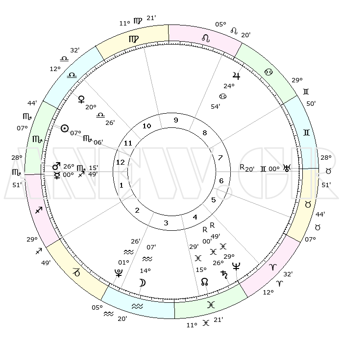 | | ΘΕΣΕΙΣ ΠΛΑΝΗΤΩΝ ΑΣΤΡΟΛΟΓΙΚΟΥ ΧΑΡΤΗ ΤΗΣ ΣΤΙΓΜΗΣ ΑΥΤΗΣ | | | | Πλανήτης | Ζώδιο | Μοίρες | Δεκαήμ. | Σε οίκο | Απόκλιση | | Ακμές των οίκων | | Ηλιος | Σκορπιός | 06°35' | Πρώτο | 5 | 13 S 43 | | 1ος | 25°50' | Δίδυμοι | | Σελήνη | Υδροχόος | 07°31' | Πρώτο | 8 | 21 S 33 | | 2ος | 16°55' | Καρκίνος | | Ερμής | Τοξότης | 00°19' | Πρώτο | 6 | 23 S 00 | | 3ος | 08°29' | Λέων | | Αφροδίτη | Ζυγός | 19°47' | Δεύτερο | 5 | 06 S 21 | | 4ος | 04°09' | Παρθένος | | Αρης | Σκορπιός | 25°53' | Τρίτο | 6 | 19 S 35 | | 5ος | 07°24' | Ζυγός | | Δίας | Καρκίνος | 24°53' | Τρίτο | 2 | 21 N 14 | | 6ος | 17°38' | Σκορπιός | | Κρόνος | Ιχθείς | 26°02'R | Τρίτο | 10 | 03 S 51 | | 7ος | 25°50' | Τοξότης | | Ουρανός | Δίδυμοι | 00°21'R | Πρώτο | 12 | 20 N 01 | | 8ος | 16°55' | Αιγόκερως | | Ποσειδώνας | Ιχθείς | 29°50'R | Τρίτο | 10 | 01 S 19 | | 9ος | 08°29' | Υδροχόος | | Πλούτωνας | Υδροχόος | 01°26' | Πρώτο | 8 | 23 S 31 | | 10ος | 04°09' | Ιχθείς | | Β. Δεσμός | Ιχθείς | 15°31' | Δεύτερο | 10 | 05 S 42 | | 11ος | 07°24' | Κριός | | Ωροσκόπος | Δίδυμοι | 25°50' | Τρίτο | | | 12ος | 17°38' | Ταύρος | | Μεσουράνημα | Ιχθείς | 04°09' | Πρώτο | | | |