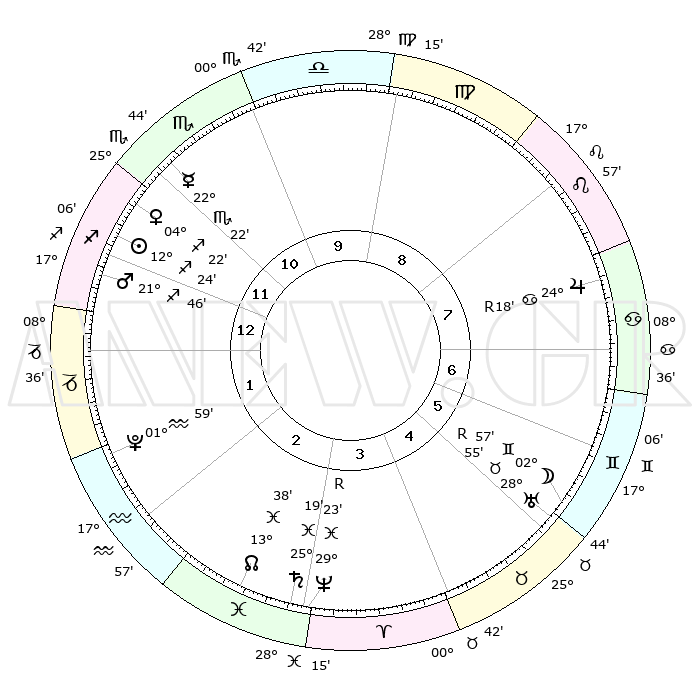 | | ΘΕΣΕΙΣ ΠΛΑΝΗΤΩΝ ΑΣΤΡΟΛΟΓΙΚΟΥ ΧΑΡΤΗ ΤΗΣ ΣΤΙΓΜΗΣ ΑΥΤΗΣ | | | | Πλανήτης | Ζώδιο | Μοίρες | Δεκαήμ. | Σε οίκο | Απόκλιση | | Ακμές των οίκων | | Ηλιος | Τοξότης | 12°21' | Δεύτερο | 12 | 22 S 16 | | 1ος | 25°59' | Τοξότης | | Σελήνη | Δίδυμοι | 02°22' | Πρώτο | 5 | 25 N 26 | | 2ος | 02°08' | Υδροχόος | | Ερμής | Σκορπιός | 22°21' | Τρίτο | 11 | 15 S 52 | | 3ος | 11°47' | Ιχθείς | | Αφροδίτη | Τοξότης | 04°19' | Πρώτο | 11 | 20 S 26 | | 4ος | 16°20' | Κριός | | Αρης | Τοξότης | 21°44' | Τρίτο | 12 | 23 S 52 | | 5ος | 13°18' | Ταύρος | | Δίας | Καρκίνος | 24°18'R | Τρίτο | 7 | 21 N 25 | | 6ος | 05°23' | Δίδυμοι | | Κρόνος | Ιχθείς | 25°19' | Τρίτο | 3 | 04 S 02 | | 7ος | 25°58' | Δίδυμοι | | Ουρανός | Ταύρος | 28°55'R | Τρίτο | 5 | 19 N 43 | | 8ος | 02°08' | Λέων | | Ποσειδώνας | Ιχθείς | 29°23'R | Τρίτο | 3 | 01 S 29 | | 9ος | 11°47' | Παρθένος | | Πλούτωνας | Υδροχόος | 01°59' | Πρώτο | 1 | 23 S 23 | | 10ος | 16°19' | Ζυγός | | Β. Δεσμός | Ιχθείς | 13°38' | Δεύτερο | 3 | 06 S 26 | | 11ος | 13°18' | Σκορπιός | | Ωροσκόπος | Τοξότης | 25°59' | Τρίτο | | | 12ος | 05°23' | Τοξότης | | Μεσουράνημα | Ζυγός | 16°19' | Δεύτερο | | | |