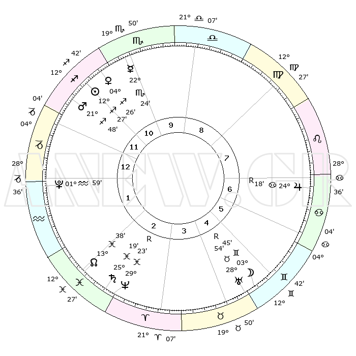 | | ΘΕΣΕΙΣ ΠΛΑΝΗΤΩΝ ΑΣΤΡΟΛΟΓΙΚΟΥ ΧΑΡΤΗ ΤΗΣ ΣΤΙΓΜΗΣ ΑΥΤΗΣ | | | | Πλανήτης | Ζώδιο | Μοίρες | Δεκαήμ. | Σε οίκο | Απόκλιση | | Ακμές των οίκων | | Ηλιος | Τοξότης | 12°25' | Δεύτερο | 11 | 22 S 17 | | 1ος | 13°52' | Αιγόκερως | | Σελήνη | Δίδυμοι | 03°10' | Πρώτο | 5 | 25 N 36 | | 2ος | 24°32' | Υδροχόος | | Ερμής | Σκορπιός | 22°23' | Τρίτο | 10 | 15 S 53 | | 3ος | 04°43' | Κριός | | Αφροδίτη | Τοξότης | 04°23' | Πρώτο | 11 | 20 S 27 | | 4ος | 06°10' | Ταύρος | | Αρης | Τοξότης | 21°47' | Τρίτο | 12 | 23 S 52 | | 5ος | 00°30' | Δίδυμοι | | Δίας | Καρκίνος | 24°18'R | Τρίτο | 7 | 21 N 25 | | 6ος | 21°45' | Δίδυμοι | | Κρόνος | Ιχθείς | 25°19' | Τρίτο | 2 | 04 S 02 | | 7ος | 13°52' | Καρκίνος | | Ουρανός | Ταύρος | 28°55'R | Τρίτο | 4 | 19 N 43 | | 8ος | 24°32' | Λέων | | Ποσειδώνας | Ιχθείς | 29°23'R | Τρίτο | 2 | 01 S 29 | | 9ος | 04°43' | Ζυγός | | Πλούτωνας | Υδροχόος | 01°59' | Πρώτο | 1 | 23 S 23 | | 10ος | 06°10' | Σκορπιός | | Β. Δεσμός | Ιχθείς | 13°38' | Δεύτερο | 2 | 06 S 26 | | 11ος | 00°30' | Τοξότης | | Ωροσκόπος | Αιγόκερως | 13°52' | Δεύτερο | | | 12ος | 21°45' | Τοξότης | | Μεσουράνημα | Σκορπιός | 06°10' | Πρώτο | | | |