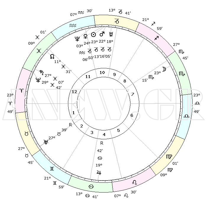 | | ΘΕΣΕΙΣ ΠΛΑΝΗΤΩΝ ΑΣΤΡΟΛΟΓΙΚΟΥ ΧΑΡΤΗ ΤΗΣ ΣΤΙΓΜΗΣ ΑΥΤΗΣ | | | | Πλανήτης | Ζώδιο | Μοίρες | Δεκαήμ. | Σε οίκο | Απόκλιση | | Ακμές των οίκων | | Ηλιος | Αιγόκερως | 23°08' | Τρίτο | 11 | 21 S 27 | | 1ος | 07°33' | Ιχθείς | | Σελήνη | Σκορπιός | 22°18' | Τρίτο | 8 | 23 S 03 | | 2ος | 22°10' | Κριός | | Ερμής | Αιγόκερως | 17°57' | Δεύτερο | 11 | 23 S 54 | | 3ος | 23°25' | Ταύρος | | Αφροδίτη | Αιγόκερως | 24°44' | Τρίτο | 11 | 22 S 05 | | 4ος | 17°08' | Δίδυμοι | | Αρης | Αιγόκερως | 22°12' | Τρίτο | 11 | 22 S 33 | | 5ος | 08°51' | Καρκίνος | | Δίας | Καρκίνος | 19°42'R | Δεύτερο | 5 | 22 N 15 | | 6ος | 03°14' | Λέων | | Κρόνος | Ιχθείς | 27°07' | Τρίτο | 1 | 03 S 11 | | 7ος | 07°33' | Παρθένος | | Ουρανός | Ταύρος | 27°40'R | Τρίτο | 3 | 19 N 27 | | 8ος | 22°10' | Ζυγός | | Ποσειδώνας | Ιχθείς | 29°42' | Τρίτο | 1 | 01 S 20 | | 9ος | 23°26' | Σκορπιός | | Πλούτωνας | Υδροχόος | 03°06' | Πρώτο | 11 | 23 S 08 | | 10ος | 17°08' | Τοξότης | | Β. Δεσμός | Ιχθείς | 11°31' | Δεύτερο | 1 | 07 S 15 | | 11ος | 08°51' | Αιγόκερως | | Ωροσκόπος | Ιχθείς | 07°33' | Πρώτο | | | 12ος | 03°14' | Υδροχόος | | Μεσουράνημα | Τοξότης | 17°08' | Δεύτερο | | | |