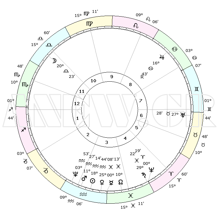 | | ΘΕΣΕΙΣ ΠΛΑΝΗΤΩΝ ΑΣΤΡΟΛΟΓΙΚΟΥ ΧΑΡΤΗ ΤΗΣ ΣΤΙΓΜΗΣ ΑΥΤΗΣ | | | | Πλανήτης | Ζώδιο | Μοίρες | Δεκαήμ. | Σε οίκο | Απόκλιση | | Ακμές των οίκων | | Ηλιος | Υδροχόος | 18°10' | Δεύτερο | 3 | 15 S 23 | | 1ος | 14°23' | Σκορπιός | | Σελήνη | Ζυγός | 19°39' | Δεύτερο | 11 | 10 S 51 | | 2ος | 13°48' | Τοξότης | | Ερμής | Ιχθείς | 00°01' | Πρώτο | 4 | 12 S 43 | | 3ος | 17°13' | Αιγόκερως | | Αφροδίτη | Υδροχόος | 25°40' | Τρίτο | 4 | 14 S 19 | | 4ος | 22°27' | Υδροχόος | | Αρης | Υδροχόος | 11°24' | Δεύτερο | 3 | 18 S 22 | | 5ος | 24°54' | Ιχθείς | | Δίας | Καρκίνος | 16°44'R | Δεύτερο | 8 | 22 N 42 | | 6ος | 22°01' | Κριός | | Κρόνος | Ιχθείς | 29°22' | Τρίτο | 5 | 02 S 14 | | 7ος | 14°23' | Ταύρος | | Ουρανός | Ταύρος | 27°28' | Τρίτο | 7 | 19 N 24 | | 8ος | 13°48' | Δίδυμοι | | Ποσειδώνας | Κριός | 00°19' | Πρώτο | 5 | 01 S 05 | | 9ος | 17°13' | Καρκίνος | | Πλούτωνας | Υδροχόος | 03°53' | Πρώτο | 3 | 22 S 59 | | 10ος | 22°27' | Λέων | | Β. Δεσμός | Ιχθείς | 10°13' | Δεύτερο | 4 | 07 S 44 | | 11ος | 24°54' | Παρθένος | | Ωροσκόπος | Σκορπιός | 14°23' | Δεύτερο | | | 12ος | 22°01' | Ζυγός | | Μεσουράνημα | Λέων | 22°27' | Τρίτο | | | |