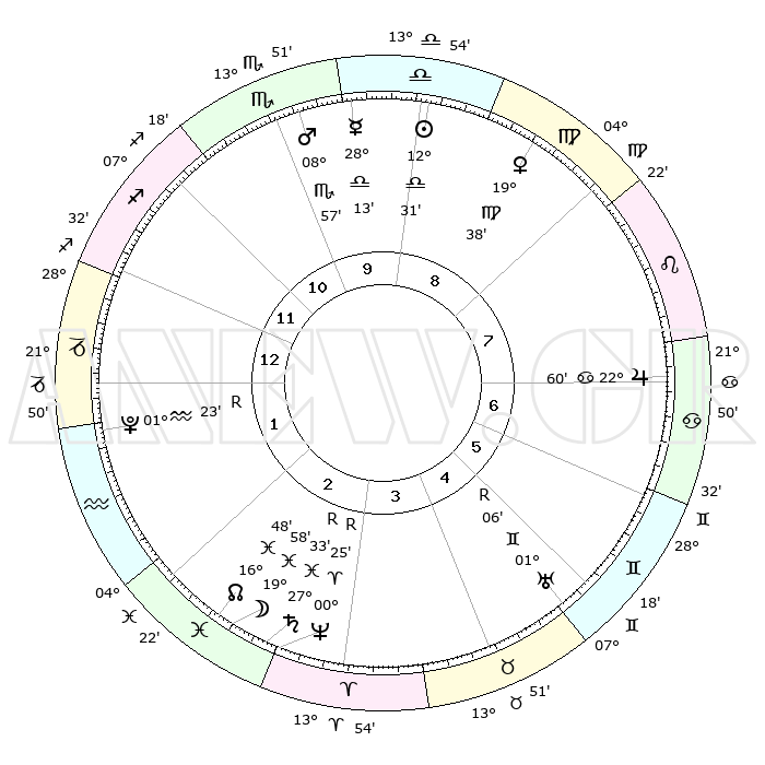 | ΘΕΣΕΙΣ ΠΛΑΝΗΤΩΝ ΑΣΤΡΟΛΟΓΙΚΟΥ ΧΑΡΤΗ ΤΗΣ ΣΤΙΓΜΗΣ ΑΥΤΗΣ | | Πλανήτης | Ζώδιο | Μοίρες | Δεκαήμ. | Σε οίκο | Απόκλιση | | Ακμές των οίκων | Ηλιος | Ζυγός | 12°24' | Δεύτερο | 10 | 04 S 54 | | 1ος | 15°07' | Τοξότης | Σελήνη | Ιχθείς | 18°26' | Δεύτερο | 3 | 04 S 34 | | 2ος | 18°49' | Αιγόκερως | Ερμής | Ζυγός | 28°03' | Τρίτο | 10 | 11 S 22 | | 3ος | 27°03' | Υδροχόος | Αφροδίτη | Παρθένος | 19°30' | Δεύτερο | 9 | 05 N 25 | | 4ος | 02°45' | Κριός | Αρης | Σκορπιός | 08°53' | Πρώτο | 11 | 14 S 34 | | 5ος | 01°33' | Ταύρος | Δίας | Καρκίνος | 22°59' | Τρίτο | 8 | 21 N 30 | | 6ος | 24°41' | Ταύρος | Κρόνος | Ιχθείς | 27°34'R | Τρίτο | 3 | 03 S 16 | | 7ος | 15°07' | Δίδυμοι | Ουρανός | Δίδυμοι | 01°07'R | Πρώτο | 6 | 20 N 10 | | 8ος | 18°49' | Καρκίνος | Ποσειδώνας | Κριός | 00°26'R | Πρώτο | 3 | 01 S 05 | | 9ος | 27°03' | Λέων | Πλούτωνας | Υδροχόος | 01°23'R | Πρώτο | 2 | 23 S 32 | | 10ος | 02°45' | Ζυγός | Β. Δεσμός | Ιχθείς | 16°48' | Δεύτερο | 3 | 05 S 12 | | 11ος | 01°33' | Σκορπιός | Ωροσκόπος | Τοξότης | 15°07' | Δεύτερο | | | 12ος | 24°41' | Σκορπιός | Μεσουράνημα | Ζυγός | 02°45' | Πρώτο | | | |