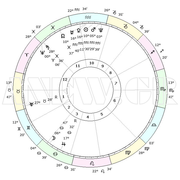 | | ΘΕΣΕΙΣ ΠΛΑΝΗΤΩΝ ΑΣΤΡΟΛΟΓΙΚΟΥ ΧΑΡΤΗ ΤΗΣ ΣΤΙΓΜΗΣ ΑΥΤΗΣ | | | | Πλανήτης | Ζώδιο | Μοίρες | Δεκαήμ. | Σε οίκο | Απόκλιση | | Ακμές των οίκων | | Ηλιος | Υδροχόος | 10°27' | Δεύτερο | 11 | 17 S 37 | | 1ος | 15°05' | Κριός | | Σελήνη | Καρκίνος | 06°01' | Πρώτο | 3 | 27 N 57 | | 2ος | 21°27' | Ταύρος | | Ερμής | Υδροχόος | 16°35' | Δεύτερο | 11 | 17 S 44 | | 3ος | 16°44' | Δίδυμοι | | Αφροδίτη | Υδροχόος | 16°07' | Δεύτερο | 11 | 17 S 17 | | 4ος | 08°33' | Καρκίνος | | Αρης | Υδροχόος | 05°27' | Πρώτο | 11 | 19 S 54 | | 5ος | 01°42' | Λέων | | Δίας | Καρκίνος | 17°33'R | Δεύτερο | 4 | 22 N 35 | | 6ος | 01°36' | Παρθένος | | Κρόνος | Ιχθείς | 28°36' | Τρίτο | 12 | 02 S 33 | | 7ος | 15°05' | Ζυγός | | Ουρανός | Ταύρος | 27°28'R | Τρίτο | 2 | 19 N 24 | | 8ος | 21°27' | Σκορπιός | | Ποσειδώνας | Κριός | 00°06' | Πρώτο | 12 | 01 S 10 | | 9ος | 16°44' | Τοξότης | | Πλούτωνας | Υδροχόος | 03°39' | Πρώτο | 11 | 23 S 02 | | 10ος | 08°33' | Αιγόκερως | | Β. Δεσμός | Ιχθείς | 10°37' | Δεύτερο | 12 | 07 S 35 | | 11ος | 01°42' | Υδροχόος | | Ωροσκόπος | Κριός | 15°05' | Δεύτερο | | | 12ος | 01°36' | Ιχθείς | | Μεσουράνημα | Αιγόκερως | 08°33' | Πρώτο | | | |