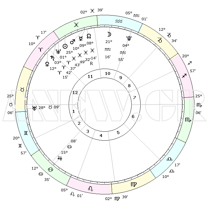 | | ΘΕΣΕΙΣ ΠΛΑΝΗΤΩΝ ΑΣΤΡΟΛΟΓΙΚΟΥ ΧΑΡΤΗ ΤΗΣ ΣΤΙΓΜΗΣ ΑΥΤΗΣ | | | | Πλανήτης | Ζώδιο | Μοίρες | Δεκαήμ. | Σε οίκο | Απόκλιση | | Ακμές των οίκων | | Ηλιος | Ιχθείς | 25°39' | Τρίτο | 12 | 01 S 44 | | 1ος | 19°26' | Κριός | | Σελήνη | Υδροχόος | 20°21' | Τρίτο | 11 | 16 S 18 | | 2ος | 24°36' | Ταύρος | | Ερμής | Ιχθείς | 09°34'R | Πρώτο | 12 | 06 S 01 | | 3ος | 19°20' | Δίδυμοι | | Αφροδίτη | Κριός | 12°10' | Δεύτερο | 12 | 03 N 53 | | 4ος | 11°04' | Καρκίνος | | Αρης | Ιχθείς | 10°45' | Δεύτερο | 12 | 08 S 32 | | 5ος | 04°33' | Λέων | | Δίας | Καρκίνος | 15°08' | Δεύτερο | 4 | 22 N 56 | | 6ος | 05°14' | Παρθένος | | Κρόνος | Κριός | 03°42' | Πρώτο | 12 | 00 S 29 | | 7ος | 19°26' | Ζυγός | | Ουρανός | Ταύρος | 28°09' | Τρίτο | 2 | 19 N 34 | | 8ος | 24°36' | Σκορπιός | | Ποσειδώνας | Κριός | 01°37' | Πρώτο | 12 | 00 S 33 | | 9ος | 19°20' | Τοξότης | | Πλούτωνας | Υδροχόος | 04°55' | Πρώτο | 11 | 22 S 49 | | 10ος | 11°04' | Αιγόκερως | | Β. Δεσμός | Ιχθείς | 08°14' | Πρώτο | 12 | 08 S 29 | | 11ος | 04°33' | Υδροχόος | | Ωροσκόπος | Κριός | 19°26' | Δεύτερο | | | 12ος | 05°14' | Ιχθείς | | Μεσουράνημα | Αιγόκερως | 11°04' | Δεύτερο | | | |