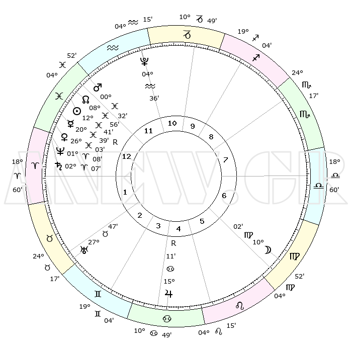 | | ΘΕΣΕΙΣ ΠΛΑΝΗΤΩΝ ΑΣΤΡΟΛΟΓΙΚΟΥ ΧΑΡΤΗ ΤΗΣ ΣΤΙΓΜΗΣ ΑΥΤΗΣ | | | | Πλανήτης | Ζώδιο | Μοίρες | Δεκαήμ. | Σε οίκο | Απόκλιση | | Ακμές των οίκων | | Ηλιος | Ιχθείς | 12°38' | Δεύτερο | 12 | 06 S 49 | | 1ος | 13°19' | Ιχθείς | | Σελήνη | Παρθένος | 09°13' | Πρώτο | 6 | 08 N 05 | | 2ος | 27°05' | Κριός | | Ερμής | Ιχθείς | 20°42'R | Τρίτο | 1 | 00 S 24 | | 3ος | 27°16' | Ταύρος | | Αφροδίτη | Ιχθείς | 25°59' | Τρίτο | 1 | 02 S 49 | | 4ος | 20°32' | Δίδυμοι | | Αρης | Ιχθείς | 00°30' | Πρώτο | 12 | 12 S 19 | | 5ος | 12°19' | Καρκίνος | | Δίας | Καρκίνος | 15°11'R | Δεύτερο | 5 | 22 N 55 | | 6ος | 07°24' | Λέων | | Κρόνος | Κριός | 02°06' | Πρώτο | 1 | 01 S 07 | | 7ος | 13°19' | Παρθένος | | Ουρανός | Ταύρος | 27°47' | Τρίτο | 3 | 19 N 29 | | 8ος | 27°05' | Ζυγός | | Ποσειδώνας | Κριός | 01°08' | Πρώτο | 1 | 00 S 45 | | 9ος | 27°16' | Σκορπιός | | Πλούτωνας | Υδροχόος | 04°36' | Πρώτο | 11 | 22 S 52 | | 10ος | 20°32' | Τοξότης | | Β. Δεσμός | Ιχθείς | 08°56' | Πρώτο | 12 | 08 S 13 | | 11ος | 12°19' | Αιγόκερως | | Ωροσκόπος | Ιχθείς | 13°19' | Δεύτερο | | | 12ος | 07°24' | Υδροχόος | | Μεσουράνημα | Τοξότης | 20°32' | Τρίτο | | | |