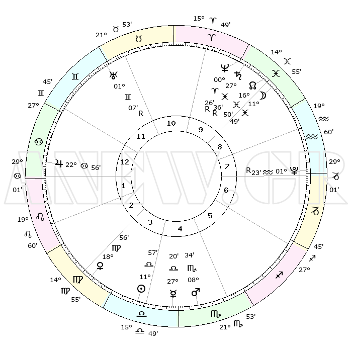| ΘΕΣΕΙΣ ΠΛΑΝΗΤΩΝ ΑΣΤΡΟΛΟΓΙΚΟΥ ΧΑΡΤΗ ΤΗΣ ΣΤΙΓΜΗΣ ΑΥΤΗΣ | | Πλανήτης | Ζώδιο | Μοίρες | Δεκαήμ. | Σε οίκο | Απόκλιση | | Ακμές των οίκων | Ηλιος | Ζυγός | 11°51' | Δεύτερο | 5 | 04 S 41 | | 1ος | 27°11' | Δίδυμοι | Σελήνη | Ιχθείς | 10°22' | Δεύτερο | 10 | 08 S 21 | | 2ος | 18°10' | Καρκίνος | Ερμής | Ζυγός | 27°11' | Τρίτο | 5 | 10 S 59 | | 3ος | 09°48' | Λέων | Αφροδίτη | Παρθένος | 18°48' | Δεύτερο | 4 | 05 N 41 | | 4ος | 05°40' | Παρθένος | Αρης | Σκορπιός | 08°29' | Πρώτο | 5 | 14 S 27 | | 5ος | 09°09' | Ζυγός | Δίας | Καρκίνος | 22°55' | Τρίτο | 2 | 21 N 31 | | 6ος | 19°19' | Σκορπιός | Κρόνος | Ιχθείς | 27°36'R | Τρίτο | 10 | 03 S 15 | | 7ος | 27°11' | Τοξότης | Ουρανός | Δίδυμοι | 01°07'R | Πρώτο | 12 | 20 N 10 | | 8ος | 18°10' | Αιγόκερως | Ποσειδώνας | Κριός | 00°27'R | Πρώτο | 10 | 01 S 05 | | 9ος | 09°48' | Υδροχόος | Πλούτωνας | Υδροχόος | 01°23'R | Πρώτο | 8 | 23 S 32 | | 10ος | 05°40' | Ιχθείς | Β. Δεσμός | Ιχθείς | 16°50' | Δεύτερο | 10 | 05 S 12 | | 11ος | 09°09' | Κριός | Ωροσκόπος | Δίδυμοι | 27°11' | Τρίτο | | | 12ος | 19°19' | Ταύρος | Μεσουράνημα | Ιχθείς | 05°40' | Πρώτο | | | |