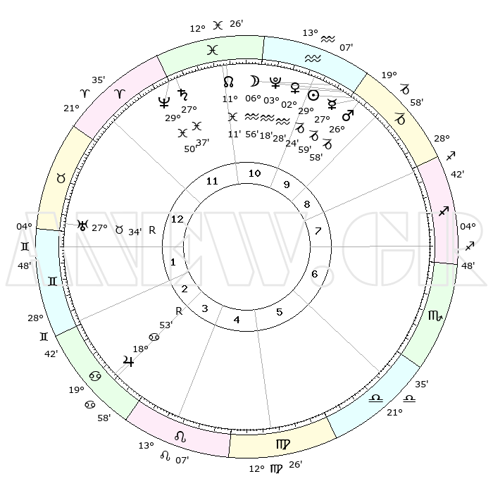| | ΘΕΣΕΙΣ ΠΛΑΝΗΤΩΝ ΑΣΤΡΟΛΟΓΙΚΟΥ ΧΑΡΤΗ ΤΗΣ ΣΤΙΓΜΗΣ ΑΥΤΗΣ | | | | Πλανήτης | Ζώδιο | Μοίρες | Δεκαήμ. | Σε οίκο | Απόκλιση | | Ακμές των οίκων | | Ηλιος | Αιγόκερως | 29°19' | Τρίτο | 10 | 20 S 17 | | 1ος | 29°45' | Κριός | | Σελήνη | Υδροχόος | 05°60' | Πρώτο | 10 | 21 S 32 | | 2ος | 02°03' | Δίδυμοι | | Ερμής | Αιγόκερως | 27°52' | Τρίτο | 10 | 22 S 32 | | 3ος | 25°38' | Δίδυμοι | | Αφροδίτη | Υδροχόος | 02°22' | Πρώτο | 10 | 20 S 42 | | 4ος | 17°19' | Καρκίνος | | Αρης | Αιγόκερως | 26°55' | Τρίτο | 10 | 21 S 45 | | 5ος | 11°41' | Λέων | | Δίας | Καρκίνος | 18°54'R | Δεύτερο | 4 | 22 N 23 | | 6ος | 14°21' | Παρθένος | | Κρόνος | Ιχθείς | 27°36' | Τρίτο | 12 | 02 S 59 | | 7ος | 29°45' | Ζυγός | | Ουρανός | Ταύρος | 27°34'R | Τρίτο | 1 | 19 N 25 | | 8ος | 02°03' | Τοξότης | | Ποσειδώνας | Ιχθείς | 29°50' | Τρίτο | 12 | 01 S 17 | | 9ος | 25°38' | Τοξότης | | Πλούτωνας | Υδροχόος | 03°18' | Πρώτο | 10 | 23 S 06 | | 10ος | 17°19' | Αιγόκερως | | Β. Δεσμός | Ιχθείς | 11°12' | Δεύτερο | 11 | 07 S 22 | | 11ος | 11°41' | Υδροχόος | | Ωροσκόπος | Κριός | 29°45' | Τρίτο | | | 12ος | 14°21' | Ιχθείς | | Μεσουράνημα | Αιγόκερως | 17°19' | Δεύτερο | | | |