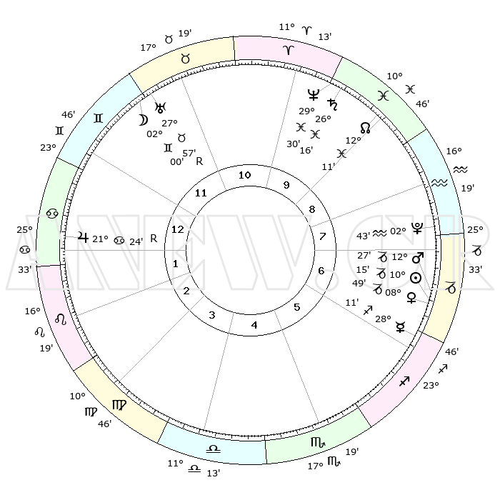 | | ΘΕΣΕΙΣ ΠΛΑΝΗΤΩΝ ΑΣΤΡΟΛΟΓΙΚΟΥ ΧΑΡΤΗ ΤΗΣ ΣΤΙΓΜΗΣ ΑΥΤΗΣ | | | | Πλανήτης | Ζώδιο | Μοίρες | Δεκαήμ. | Σε οίκο | Απόκλιση | | Ακμές των οίκων | | Ηλιος | Αιγόκερως | 10°10' | Δεύτερο | 7 | 23 S 03 | | 1ος | 00°39' | Καρκίνος | | Σελήνη | Δίδυμοι | 00°48' | Πρώτο | 12 | 25 N 11 | | 2ος | 21°25' | Καρκίνος | | Ερμής | Τοξότης | 28°04' | Τρίτο | 6 | 23 S 57 | | 3ος | 13°15' | Λέων | | Αφροδίτη | Αιγόκερως | 08°43' | Πρώτο | 7 | 23 S 38 | | 4ος | 09°41' | Παρθένος | | Αρης | Αιγόκερως | 12°24' | Δεύτερο | 7 | 23 S 44 | | 5ος | 13°43' | Ζυγός | | Δίας | Καρκίνος | 21°24'R | Τρίτο | 1 | 21 N 58 | | 6ος | 23°40' | Σκορπιός | | Κρόνος | Ιχθείς | 26°16' | Τρίτο | 10 | 03 S 34 | | 7ος | 00°39' | Αιγόκερως | | Ουρανός | Ταύρος | 27°57'R | Τρίτο | 12 | 19 N 30 | | 8ος | 21°25' | Αιγόκερως | | Ποσειδώνας | Ιχθείς | 29°30' | Τρίτο | 10 | 01 S 25 | | 9ος | 13°15' | Υδροχόος | | Πλούτωνας | Υδροχόος | 02°43' | Πρώτο | 8 | 23 S 13 | | 10ος | 09°41' | Ιχθείς | | Β. Δεσμός | Ιχθείς | 12°11' | Δεύτερο | 10 | 06 S 59 | | 11ος | 13°43' | Κριός | | Ωροσκόπος | Καρκίνος | 00°39' | Πρώτο | | | 12ος | 23°40' | Ταύρος | | Μεσουράνημα | Ιχθείς | 09°41' | Πρώτο | | | |