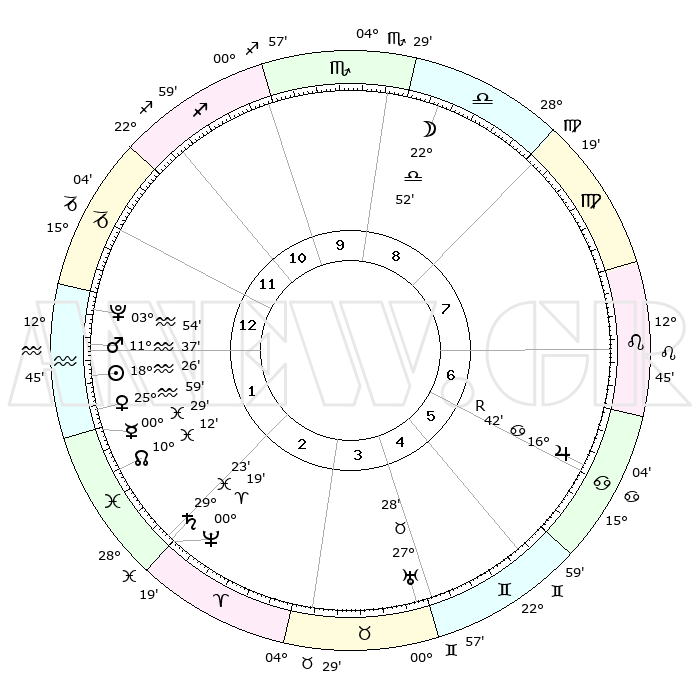 | | ΘΕΣΕΙΣ ΠΛΑΝΗΤΩΝ ΑΣΤΡΟΛΟΓΙΚΟΥ ΧΑΡΤΗ ΤΗΣ ΣΤΙΓΜΗΣ ΑΥΤΗΣ | | | | Πλανήτης | Ζώδιο | Μοίρες | Δεκαήμ. | Σε οίκο | Απόκλιση | | Ακμές των οίκων | | Ηλιος | Υδροχόος | 18°22' | Δεύτερο | 1 | 15 S 19 | | 1ος | 14°47' | Αιγόκερως | | Σελήνη | Ζυγός | 22°03' | Τρίτο | 9 | 11 S 54 | | 2ος | 25°41' | Υδροχόος | | Ερμής | Ιχθείς | 00°22' | Πρώτο | 2 | 12 S 34 | | 3ος | 05°48' | Κριός | | Αφροδίτη | Υδροχόος | 25°54' | Τρίτο | 2 | 14 S 14 | | 4ος | 07°05' | Ταύρος | | Αρης | Υδροχόος | 11°33' | Δεύτερο | 1 | 18 S 20 | | 5ος | 01°19' | Δίδυμοι | | Δίας | Καρκίνος | 16°43'R | Δεύτερο | 7 | 22 N 42 | | 6ος | 22°33' | Δίδυμοι | | Κρόνος | Ιχθείς | 29°23' | Τρίτο | 2 | 02 S 14 | | 7ος | 14°47' | Καρκίνος | | Ουρανός | Ταύρος | 27°28' | Τρίτο | 4 | 19 N 24 | | 8ος | 25°41' | Λέων | | Ποσειδώνας | Κριός | 00°19' | Πρώτο | 2 | 01 S 05 | | 9ος | 05°48' | Ζυγός | | Πλούτωνας | Υδροχόος | 03°54' | Πρώτο | 1 | 22 S 59 | | 10ος | 07°05' | Σκορπιός | | Β. Δεσμός | Ιχθείς | 10°12' | Δεύτερο | 2 | 07 S 44 | | 11ος | 01°19' | Τοξότης | | Ωροσκόπος | Αιγόκερως | 14°47' | Δεύτερο | | | 12ος | 22°33' | Τοξότης | | Μεσουράνημα | Σκορπιός | 07°05' | Πρώτο | | | |