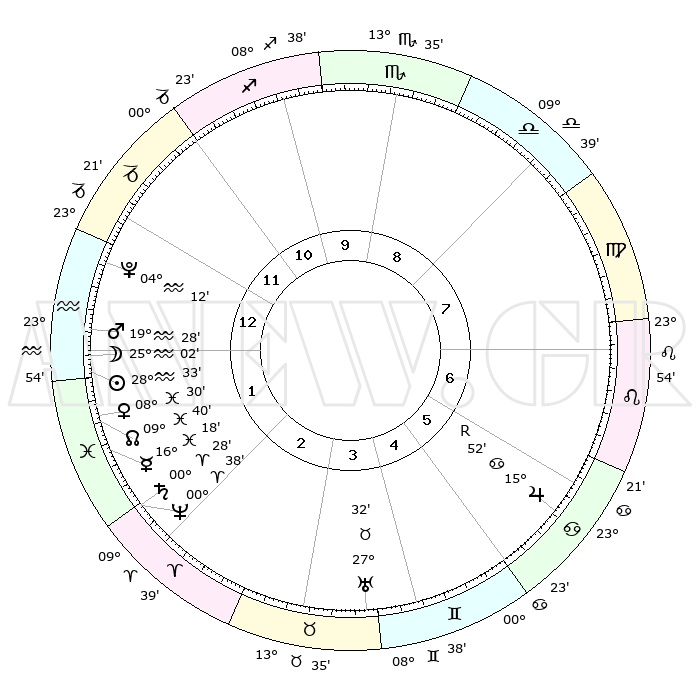 | | ΘΕΣΕΙΣ ΠΛΑΝΗΤΩΝ ΑΣΤΡΟΛΟΓΙΚΟΥ ΧΑΡΤΗ ΤΗΣ ΣΤΙΓΜΗΣ ΑΥΤΗΣ | | | | Πλανήτης | Ζώδιο | Μοίρες | Δεκαήμ. | Σε οίκο | Απόκλιση | | Ακμές των οίκων | | Ηλιος | Υδροχόος | 28°28' | Τρίτο | 1 | 12 S 00 | | 1ος | 22°19' | Αιγόκερως | | Σελήνη | Υδροχόος | 24°07' | Τρίτο | 1 | 14 S 45 | | 2ος | 04°58' | Ιχθείς | | Ερμής | Ιχθείς | 16°13' | Δεύτερο | 2 | 04 S 56 | | 3ος | 14°27' | Κριός | | Αφροδίτη | Ιχθείς | 08°25' | Πρώτο | 2 | 09 S 46 | | 4ος | 14°18' | Ταύρος | | Αρης | Υδροχόος | 19°25' | Δεύτερο | 1 | 16 S 01 | | 5ος | 07°43' | Δίδυμοι | | Δίας | Καρκίνος | 15°52'R | Δεύτερο | 6 | 22 N 49 | | 6ος | 28°57' | Δίδυμοι | | Κρόνος | Κριός | 00°28' | Πρώτο | 2 | 01 S 47 | | 7ος | 22°19' | Καρκίνος | | Ουρανός | Ταύρος | 27°32' | Τρίτο | 4 | 19 N 26 | | 8ος | 04°58' | Παρθένος | | Ποσειδώνας | Κριός | 00°38' | Πρώτο | 2 | 00 S 57 | | 9ος | 14°27' | Ζυγός | | Πλούτωνας | Υδροχόος | 04°12' | Πρώτο | 1 | 22 S 56 | | 10ος | 14°18' | Σκορπιός | | Β. Δεσμός | Ιχθείς | 09°40' | Πρώτο | 2 | 07 S 56 | | 11ος | 07°43' | Τοξότης | | Ωροσκόπος | Αιγόκερως | 22°19' | Τρίτο | | | 12ος | 28°57' | Τοξότης | | Μεσουράνημα | Σκορπιός | 14°18' | Δεύτερο | | | |