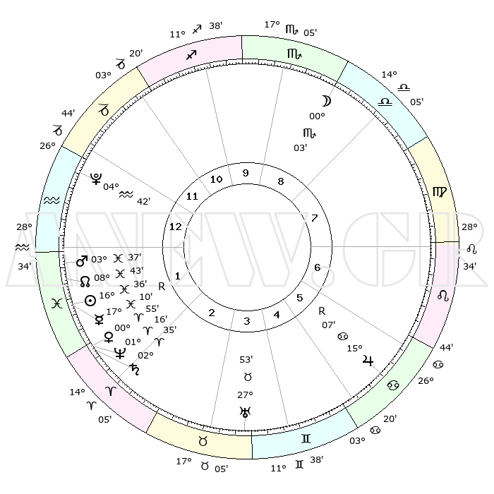 | | ΘΕΣΕΙΣ ΠΛΑΝΗΤΩΝ ΑΣΤΡΟΛΟΓΙΚΟΥ ΧΑΡΤΗ ΤΗΣ ΣΤΙΓΜΗΣ ΑΥΤΗΣ | | | | Πλανήτης | Ζώδιο | Μοίρες | Δεκαήμ. | Σε οίκο | Απόκλιση | | Ακμές των οίκων | | Ηλιος | Ιχθείς | 16°27' | Δεύτερο | 2 | 05 S 21 | | 1ος | 00°27' | Αιγόκερως | | Σελήνη | Ζυγός | 28°20' | Τρίτο | 10 | 14 S 37 | | 2ος | 07°42' | Υδροχόος | | Ερμής | Ιχθείς | 17°18'R | Δεύτερο | 2 | 01 S 38 | | 3ος | 17°44' | Ιχθείς | | Αφροδίτη | Κριός | 00°44' | Πρώτο | 3 | 00 S 51 | | 4ος | 21°36' | Κριός | | Αρης | Ιχθείς | 03°30' | Πρώτο | 2 | 11 S 14 | | 5ος | 17°51' | Ταύρος | | Δίας | Καρκίνος | 15°07'R | Δεύτερο | 7 | 22 N 56 | | 6ος | 09°38' | Δίδυμοι | | Κρόνος | Κριός | 02°34' | Πρώτο | 3 | 00 S 56 | | 7ος | 00°27' | Καρκίνος | | Ουρανός | Ταύρος | 27°53' | Τρίτο | 5 | 19 N 30 | | 8ος | 07°42' | Λέων | | Ποσειδώνας | Κριός | 01°16' | Πρώτο | 3 | 00 S 42 | | 9ος | 17°44' | Παρθένος | | Πλούτωνας | Υδροχόος | 04°42' | Πρώτο | 1 | 22 S 51 | | 10ος | 21°36' | Ζυγός | | Β. Δεσμός | Ιχθείς | 08°44' | Πρώτο | 2 | 08 S 18 | | 11ος | 17°51' | Σκορπιός | | Ωροσκόπος | Αιγόκερως | 00°27' | Πρώτο | | | 12ος | 09°38' | Τοξότης | | Μεσουράνημα | Ζυγός | 21°36' | Τρίτο | | | |