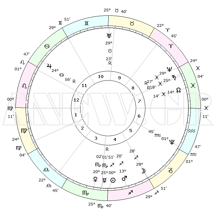 | | ΘΕΣΕΙΣ ΠΛΑΝΗΤΩΝ ΑΣΤΡΟΛΟΓΙΚΟΥ ΧΑΡΤΗ ΤΗΣ ΣΤΙΓΜΗΣ ΑΥΤΗΣ | | | | Πλανήτης | Ζώδιο | Μοίρες | Δεκαήμ. | Σε οίκο | Απόκλιση | | Ακμές των οίκων | | Ηλιος | Τοξότης | 00°48' | Πρώτο | 4 | 20 S 19 | | 1ος | 14°29' | Λέων | | Σελήνη | Τοξότης | 28°49' | Τρίτο | 5 | 28 S 17 | | 2ος | 06°44' | Παρθένος | | Ερμής | Σκορπιός | 25°05'R | Τρίτο | 4 | 17 S 45 | | 3ος | 03°43' | Ζυγός | | Αφροδίτη | Σκορπιός | 19°58' | Δεύτερο | 4 | 16 S 47 | | 4ος | 06°06' | Σκορπιός | | Αρης | Τοξότης | 13°18' | Δεύτερο | 5 | 22 S 59 | | 5ος | 11°25' | Τοξότης | | Δίας | Καρκίνος | 24°57'R | Τρίτο | 12 | 21 N 16 | | 6ος | 14°58' | Αιγόκερως | | Κρόνος | Ιχθείς | 25°18'R | Τρίτο | 8 | 04 S 04 | | 7ος | 14°29' | Υδροχόος | | Ουρανός | Ταύρος | 29°23'R | Τρίτο | 10 | 19 N 49 | | 8ος | 06°44' | Ιχθείς | | Ποσειδώνας | Ιχθείς | 29°27'R | Τρίτο | 8 | 01 S 28 | | 9ος | 03°43' | Κριός | | Πλούτωνας | Υδροχόος | 01°45' | Πρώτο | 6 | 23 S 26 | | 10ος | 06°06' | Ταύρος | | Β. Δεσμός | Ιχθείς | 14°15' | Δεύτερο | 8 | 06 S 12 | | 11ος | 11°25' | Δίδυμοι | | Ωροσκόπος | Λέων | 14°29' | Δεύτερο | | | 12ος | 14°58' | Καρκίνος | | Μεσουράνημα | Ταύρος | 06°06' | Πρώτο | | | |