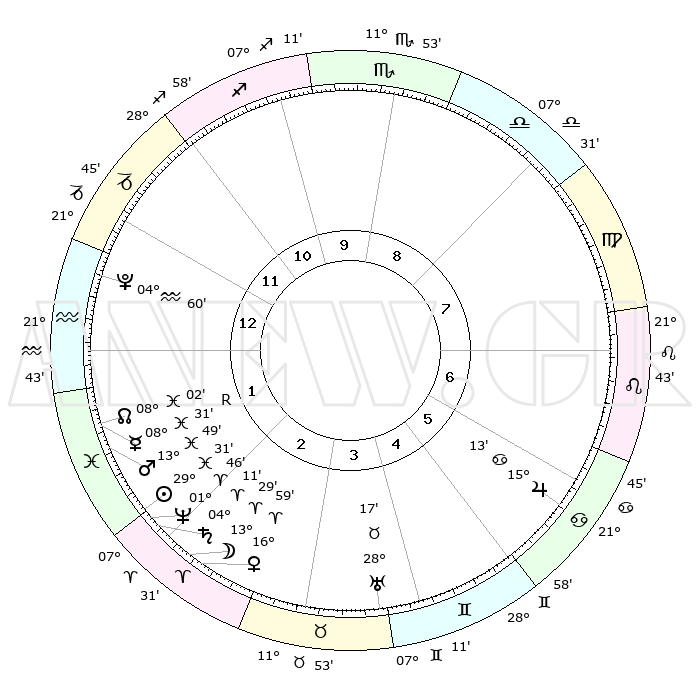 | | ΘΕΣΕΙΣ ΠΛΑΝΗΤΩΝ ΑΣΤΡΟΛΟΓΙΚΟΥ ΧΑΡΤΗ ΤΗΣ ΣΤΙΓΜΗΣ ΑΥΤΗΣ | | | | Πλανήτης | Ζώδιο | Μοίρες | Δεκαήμ. | Σε οίκο | Απόκλιση | | Ακμές των οίκων | | Ηλιος | Ιχθείς | 29°26' | Τρίτο | 2 | 00 S 13 | | 1ος | 16°55' | Αιγόκερως | | Σελήνη | Κριός | 12°21' | Δεύτερο | 3 | 07 N 33 | | 2ος | 28°20' | Υδροχόος | | Ερμής | Ιχθείς | 08°31'R | Πρώτο | 2 | 07 S 17 | | 3ος | 08°19' | Κριός | | Αφροδίτη | Κριός | 16°53' | Δεύτερο | 3 | 05 N 49 | | 4ος | 09°11' | Ταύρος | | Αρης | Ιχθείς | 13°45' | Δεύτερο | 2 | 07 S 23 | | 5ος | 03°10' | Δίδυμοι | | Δίας | Καρκίνος | 15°13' | Δεύτερο | 6 | 22 N 56 | | 6ος | 24°23' | Δίδυμοι | | Κρόνος | Κριός | 04°10' | Πρώτο | 2 | 00 S 18 | | 7ος | 16°55' | Καρκίνος | | Ουρανός | Ταύρος | 28°17' | Τρίτο | 4 | 19 N 36 | | 8ος | 28°20' | Λέων | | Ποσειδώνας | Κριός | 01°45' | Πρώτο | 2 | 00 S 30 | | 9ος | 08°19' | Ζυγός | | Πλούτωνας | Υδροχόος | 04°60' | Πρώτο | 1 | 22 S 49 | | 10ος | 09°11' | Σκορπιός | | Β. Δεσμός | Ιχθείς | 08°02' | Πρώτο | 2 | 08 S 33 | | 11ος | 03°10' | Τοξότης | | Ωροσκόπος | Αιγόκερως | 16°55' | Δεύτερο | | | 12ος | 24°23' | Τοξότης | | Μεσουράνημα | Σκορπιός | 09°11' | Πρώτο | | | |