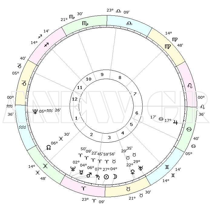 | | ΘΕΣΕΙΣ ΠΛΑΝΗΤΩΝ ΑΣΤΡΟΛΟΓΙΚΟΥ ΧΑΡΤΗ ΤΗΣ ΣΤΙΓΜΗΣ ΑΥΤΗΣ | | | | Πλανήτης | Ζώδιο | Μοίρες | Δεκαήμ. | Σε οίκο | Απόκλιση | | Ακμές των οίκων | | Ηλιος | Κριός | 27°56' | Τρίτο | 3 | 10 N 44 | | 1ος | 07°35' | Αιγόκερως | | Σελήνη | Ταύρος | 04°02' | Πρώτο | 4 | 16 N 51 | | 2ος | 16°40' | Υδροχόος | | Ερμής | Κριός | 04°04' | Πρώτο | 3 | 00 S 48 | | 3ος | 26°58' | Ιχθείς | | Αφροδίτη | Ταύρος | 22°25' | Τρίτο | 4 | 18 N 40 | | 4ος | 29°36' | Κριός | | Αρης | Κριός | 06°19' | Πρώτο | 3 | 01 N 37 | | 5ος | 24°46' | Ταύρος | | Δίας | Καρκίνος | 17°17' | Δεύτερο | 7 | 22 N 42 | | 6ος | 16°11' | Δίδυμοι | | Κρόνος | Κριός | 07°44' | Πρώτο | 3 | 01 N 06 | | 7ος | 07°35' | Καρκίνος | | Ουρανός | Ταύρος | 29°34' | Τρίτο | 5 | 19 N 53 | | 8ος | 16°40' | Λέων | | Ποσειδώνας | Κριός | 02°50' | Πρώτο | 3 | 00 S 05 | | 9ος | 26°58' | Παρθένος | | Πλούτωνας | Υδροχόος | 05°26' | Πρώτο | 1 | 22 S 47 | | 10ος | 29°36' | Ζυγός | | Β. Δεσμός | Ιχθείς | 06°30' | Πρώτο | 2 | 09 S 07 | | 11ος | 24°46' | Σκορπιός | | Ωροσκόπος | Αιγόκερως | 07°35' | Πρώτο | | | 12ος | 16°11' | Τοξότης | | Μεσουράνημα | Ζυγός | 29°36' | Τρίτο | | | |