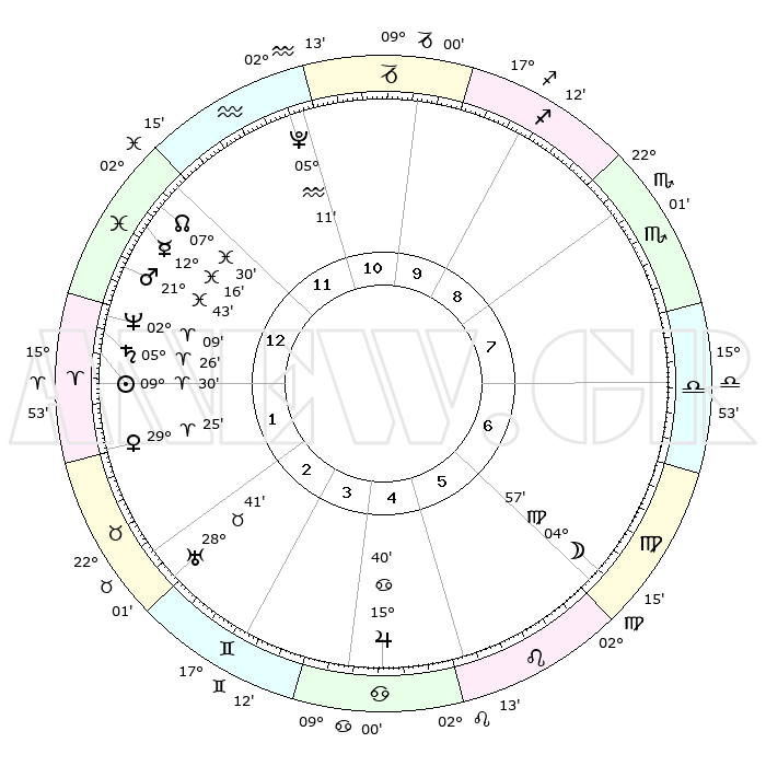 | | ΘΕΣΕΙΣ ΠΛΑΝΗΤΩΝ ΑΣΤΡΟΛΟΓΙΚΟΥ ΧΑΡΤΗ ΤΗΣ ΣΤΙΓΜΗΣ ΑΥΤΗΣ | | | | Πλανήτης | Ζώδιο | Μοίρες | Δεκαήμ. | Σε οίκο | Απόκλιση | | Ακμές των οίκων | | Ηλιος | Κριός | 09°20' | Πρώτο | 2 | 03 N 42 | | 1ος | 18°03' | Αιγόκερως | | Σελήνη | Παρθένος | 02°42' | Πρώτο | 8 | 11 N 02 | | 2ος | 29°44' | Υδροχόος | | Ερμής | Ιχθείς | 12°08' | Δεύτερο | 2 | 07 S 55 | | 3ος | 09°38' | Κριός | | Αφροδίτη | Κριός | 29°13' | Τρίτο | 3 | 10 N 42 | | 4ος | 10°17' | Ταύρος | | Αρης | Ιχθείς | 21°35' | Τρίτο | 2 | 04 S 18 | | 5ος | 04°09' | Δίδυμοι | | Δίας | Καρκίνος | 15°39' | Δεύτερο | 6 | 22 N 53 | | 6ος | 25°21' | Δίδυμοι | | Κρόνος | Κριός | 05°25' | Πρώτο | 2 | 00 N 12 | | 7ος | 18°03' | Καρκίνος | | Ουρανός | Ταύρος | 28°41' | Τρίτο | 4 | 19 N 42 | | 8ος | 29°44' | Λέων | | Ποσειδώνας | Κριός | 02°08' | Πρώτο | 2 | 00 S 21 | | 9ος | 09°38' | Ζυγός | | Πλούτωνας | Υδροχόος | 05°11' | Πρώτο | 1 | 22 S 48 | | 10ος | 10°17' | Σκορπιός | | Β. Δεσμός | Ιχθείς | 07°30' | Πρώτο | 2 | 08 S 45 | | 11ος | 04°09' | Τοξότης | | Ωροσκόπος | Αιγόκερως | 18°03' | Δεύτερο | | | 12ος | 25°21' | Τοξότης | | Μεσουράνημα | Σκορπιός | 10°17' | Δεύτερο | | | |