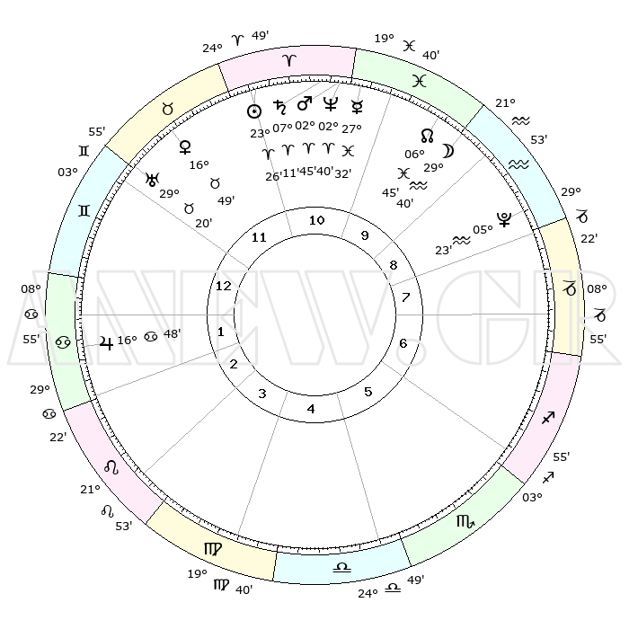 | | ΘΕΣΕΙΣ ΠΛΑΝΗΤΩΝ ΑΣΤΡΟΛΟΓΙΚΟΥ ΧΑΡΤΗ ΤΗΣ ΣΤΙΓΜΗΣ ΑΥΤΗΣ | | | | Πλανήτης | Ζώδιο | Μοίρες | Δεκαήμ. | Σε οίκο | Απόκλιση | | Ακμές των οίκων | | Ηλιος | Κριός | 23°22' | Τρίτο | 11 | 09 N 04 | | 1ος | 15°24' | Δίδυμοι | | Σελήνη | Υδροχόος | 28°46' | Τρίτο | 10 | 12 S 42 | | 2ος | 07°36' | Καρκίνος | | Ερμής | Ιχθείς | 27°27' | Τρίτο | 11 | 03 S 20 | | 3ος | 28°50' | Καρκίνος | | Αφροδίτη | Ταύρος | 16°43' | Δεύτερο | 12 | 16 N 55 | | 4ος | 23°06' | Λέων | | Αρης | Κριός | 02°42' | Πρώτο | 11 | 00 N 10 | | 5ος | 24°24' | Παρθένος | | Δίας | Καρκίνος | 16°48' | Δεύτερο | 2 | 22 N 45 | | 6ος | 04°32' | Σκορπιός | | Κρόνος | Κριός | 07°11' | Πρώτο | 11 | 00 N 53 | | 7ος | 15°24' | Τοξότης | | Ουρανός | Ταύρος | 29°20' | Τρίτο | 12 | 19 N 50 | | 8ος | 07°36' | Αιγόκερως | | Ποσειδώνας | Κριός | 02°40' | Πρώτο | 11 | 00 S 09 | | 9ος | 28°50' | Αιγόκερως | | Πλούτωνας | Υδροχόος | 05°23' | Πρώτο | 9 | 22 S 47 | | 10ος | 23°06' | Υδροχόος | | Β. Δεσμός | Ιχθείς | 06°45' | Πρώτο | 10 | 09 S 02 | | 11ος | 24°24' | Ιχθείς | | Ωροσκόπος | Δίδυμοι | 15°24' | Δεύτερο | | | 12ος | 04°32' | Ταύρος | | Μεσουράνημα | Υδροχόος | 23°06' | Τρίτο | | | |