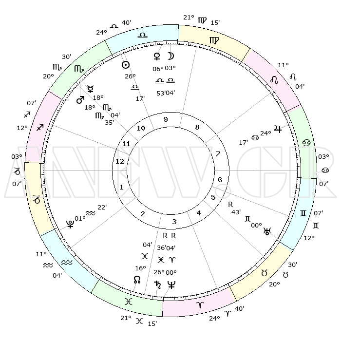 | ΘΕΣΕΙΣ ΠΛΑΝΗΤΩΝ ΑΣΤΡΟΛΟΓΙΚΟΥ ΧΑΡΤΗ ΤΗΣ ΣΤΙΓΜΗΣ ΑΥΤΗΣ | | Πλανήτης | Ζώδιο | Μοίρες | Δεκαήμ. | Σε οίκο | Απόκλιση | | Ακμές των οίκων | Ηλιος | Ζυγός | 26°11' | Τρίτο | 11 | 10 S 06 | | 1ος | 01°39' | Τοξότης | Σελήνη | Ζυγός | 01°50' | Πρώτο | 10 | 01 S 52 | | 2ος | 03°01' | Αιγόκερως | Ερμής | Σκορπιός | 17°56' | Δεύτερο | 12 | 19 S 15 | | 3ος | 08°59' | Υδροχόος | Αφροδίτη | Ζυγός | 06°46' | Πρώτο | 10 | 01 S 16 | | 4ος | 15°04' | Ιχθείς | Αρης | Σκορπιός | 18°31' | Δεύτερο | 12 | 17 S 35 | | 5ος | 15°53' | Κριός | Δίας | Καρκίνος | 24°16' | Τρίτο | 8 | 21 N 19 | | 6ος | 10°43' | Ταύρος | Κρόνος | Ιχθείς | 26°37'R | Τρίτο | 4 | 03 S 38 | | 7ος | 01°39' | Δίδυμοι | Ουρανός | Δίδυμοι | 00°43'R | Πρώτο | 6 | 20 N 05 | | 8ος | 03°01' | Καρκίνος | Ποσειδώνας | Κριός | 00°04'R | Πρώτο | 4 | 01 S 14 | | 9ος | 08°59' | Λέων | Πλούτωνας | Υδροχόος | 01°22' | Πρώτο | 2 | 23 S 32 | | 10ος | 15°04' | Παρθένος | Β. Δεσμός | Ιχθείς | 16°04' | Δεύτερο | 4 | 05 S 30 | | 11ος | 15°53' | Ζυγός | Ωροσκόπος | Τοξότης | 01°39' | Πρώτο | | | 12ος | 10°43' | Σκορπιός | Μεσουράνημα | Παρθένος | 15°04' | Δεύτερο | | | |