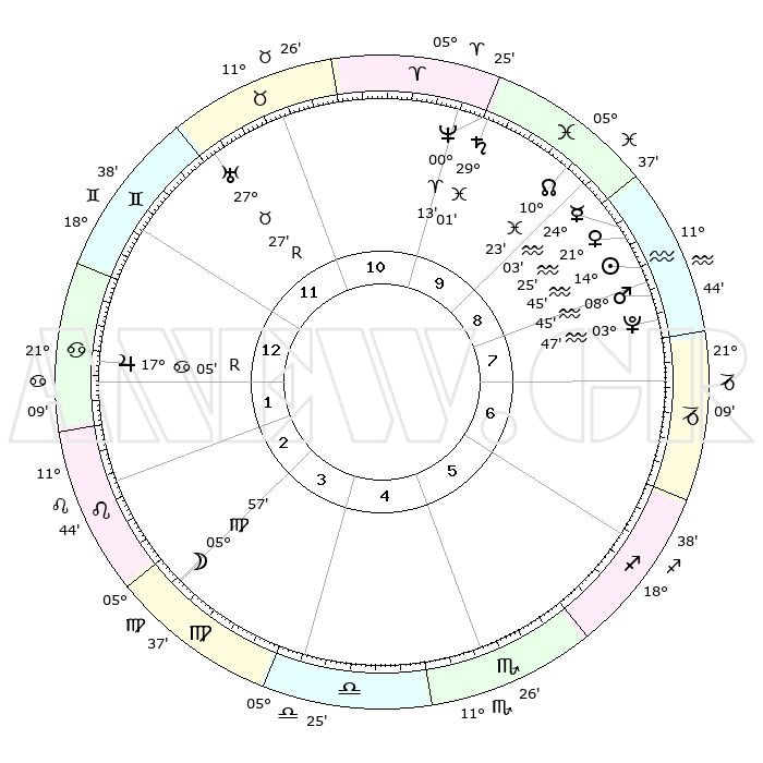 | | ΘΕΣΕΙΣ ΠΛΑΝΗΤΩΝ ΑΣΤΡΟΛΟΓΙΚΟΥ ΧΑΡΤΗ ΤΗΣ ΣΤΙΓΜΗΣ ΑΥΤΗΣ | | | | Πλανήτης | Ζώδιο | Μοίρες | Δεκαήμ. | Σε οίκο | Απόκλιση | | Ακμές των οίκων | | Ηλιος | Υδροχόος | 14°40' | Δεύτερο | 9 | 16 S 26 | | 1ος | 26°52' | Δίδυμοι | | Σελήνη | Παρθένος | 04°55' | Πρώτο | 3 | 10 N 04 | | 2ος | 17°53' | Καρκίνος | | Ερμής | Υδροχόος | 23°55' | Τρίτο | 9 | 15 S 09 | | 3ος | 09°30' | Λέων | | Αφροδίτη | Υδροχόος | 21°19' | Τρίτο | 9 | 15 S 43 | | 4ος | 05°19' | Παρθένος | | Αρης | Υδροχόος | 08°42' | Πρώτο | 8 | 19 S 06 | | 5ος | 08°45' | Ζυγός | | Δίας | Καρκίνος | 17°05'R | Δεύτερο | 1 | 22 N 39 | | 6ος | 18°56' | Σκορπιός | | Κρόνος | Ιχθείς | 29°00' | Τρίτο | 10 | 02 S 23 | | 7ος | 26°52' | Τοξότης | | Ουρανός | Ταύρος | 27°27'R | Τρίτο | 12 | 19 N 24 | | 8ος | 17°53' | Αιγόκερως | | Ποσειδώνας | Κριός | 00°13' | Πρώτο | 10 | 01 S 07 | | 9ος | 09°30' | Υδροχόος | | Πλούτωνας | Υδροχόος | 03°47' | Πρώτο | 8 | 23 S 00 | | 10ος | 05°19' | Ιχθείς | | Β. Δεσμός | Ιχθείς | 10°24' | Δεύτερο | 10 | 07 S 40 | | 11ος | 08°45' | Κριός | | Ωροσκόπος | Δίδυμοι | 26°52' | Τρίτο | | | 12ος | 18°56' | Ταύρος | | Μεσουράνημα | Ιχθείς | 05°19' | Πρώτο | | | |