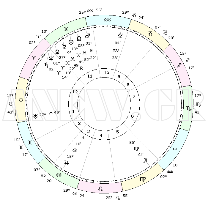| | ΘΕΣΕΙΣ ΠΛΑΝΗΤΩΝ ΑΣΤΡΟΛΟΓΙΚΟΥ ΧΑΡΤΗ ΤΗΣ ΣΤΙΓΜΗΣ ΑΥΤΗΣ | | | | Πλανήτης | Ζώδιο | Μοίρες | Δεκαήμ. | Σε οίκο | Απόκλιση | | Ακμές των οίκων | | Ηλιος | Ιχθείς | 13°41' | Δεύτερο | 12 | 06 S 25 | | 1ος | 15°47' | Κριός | | Σελήνη | Παρθένος | 23°08' | Τρίτο | 6 | 01 N 32 | | 2ος | 21°57' | Ταύρος | | Ερμής | Ιχθείς | 19°52'R | Δεύτερο | 12 | 00 S 39 | | 3ος | 17°09' | Δίδυμοι | | Αφροδίτη | Ιχθείς | 27°17' | Τρίτο | 12 | 02 S 17 | | 4ος | 08°57' | Καρκίνος | | Αρης | Ιχθείς | 01°19' | Πρώτο | 11 | 12 S 02 | | 5ος | 02°09' | Λέων | | Δίας | Καρκίνος | 15°10'R | Δεύτερο | 4 | 22 N 55 | | 6ος | 02°11' | Παρθένος | | Κρόνος | Κριός | 02°14' | Πρώτο | 12 | 01 S 04 | | 7ος | 15°47' | Ζυγός | | Ουρανός | Ταύρος | 27°48' | Τρίτο | 2 | 19 N 30 | | 8ος | 21°57' | Σκορπιός | | Ποσειδώνας | Κριός | 01°10' | Πρώτο | 12 | 00 S 44 | | 9ος | 17°09' | Τοξότης | | Πλούτωνας | Υδροχόος | 04°37' | Πρώτο | 11 | 22 S 52 | | 10ος | 08°57' | Αιγόκερως | | Β. Δεσμός | Ιχθείς | 08°52' | Πρώτο | 12 | 08 S 14 | | 11ος | 02°09' | Υδροχόος | | Ωροσκόπος | Κριός | 15°47' | Δεύτερο | | | 12ος | 02°11' | Ιχθείς | | Μεσουράνημα | Αιγόκερως | 08°57' | Πρώτο | | | |