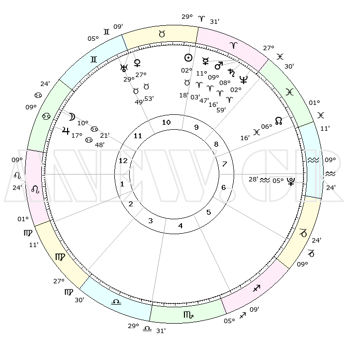 | | ΘΕΣΕΙΣ ΠΛΑΝΗΤΩΝ ΑΣΤΡΟΛΟΓΙΚΟΥ ΧΑΡΤΗ ΤΗΣ ΣΤΙΓΜΗΣ ΑΥΤΗΣ | | | | Πλανήτης | Ζώδιο | Μοίρες | Δεκαήμ. | Σε οίκο | Απόκλιση | | Ακμές των οίκων | | Ηλιος | Ταύρος | 02°15' | Πρώτο | 10 | 12 N 15 | | 1ος | 22°57' | Καρκίνος | | Σελήνη | Καρκίνος | 09°33' | Πρώτο | 12 | 27 N 24 | | 2ος | 13°36' | Λέων | | Ερμής | Κριός | 10°57' | Δεύτερο | 10 | 01 N 59 | | 3ος | 07°43' | Παρθένος | | Αφροδίτη | Ταύρος | 27°49' | Τρίτο | 11 | 20 N 10 | | 4ος | 07°47' | Ζυγός | | Αρης | Κριός | 09°45' | Πρώτο | 10 | 03 N 00 | | 5ος | 13°51' | Σκορπιός | | Δίας | Καρκίνος | 17°48' | Δεύτερο | 12 | 22 N 38 | | 6ος | 20°45' | Τοξότης | | Κρόνος | Κριός | 08°16' | Πρώτο | 10 | 01 N 18 | | 7ος | 22°57' | Αιγόκερως | | Ουρανός | Ταύρος | 29°48' | Τρίτο | 11 | 19 N 56 | | 8ος | 13°36' | Υδροχόος | | Ποσειδώνας | Κριός | 02°59' | Πρώτο | 9 | 00 S 01 | | 9ος | 07°43' | Ιχθείς | | Πλούτωνας | Υδροχόος | 05°28' | Πρώτο | 7 | 22 S 48 | | 10ος | 07°47' | Κριός | | Β. Δεσμός | Ιχθείς | 06°16' | Πρώτο | 8 | 09 S 12 | | 11ος | 13°51' | Ταύρος | | Ωροσκόπος | Καρκίνος | 22°57' | Τρίτο | | | 12ος | 20°45' | Δίδυμοι | | Μεσουράνημα | Κριός | 07°47' | Πρώτο | | | |
