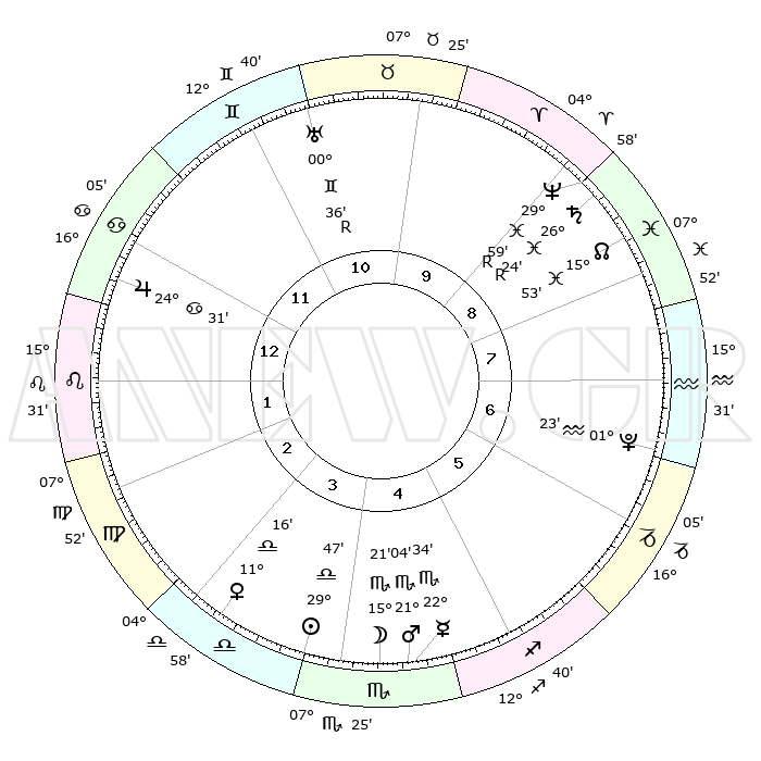 | ΘΕΣΕΙΣ ΠΛΑΝΗΤΩΝ ΑΣΤΡΟΛΟΓΙΚΟΥ ΧΑΡΤΗ ΤΗΣ ΣΤΙΓΜΗΣ ΑΥΤΗΣ | | Πλανήτης | Ζώδιο | Μοίρες | Δεκαήμ. | Σε οίκο | Απόκλιση | | Ακμές των οίκων | Ηλιος | Ζυγός | 29°40' | Τρίτο | 4 | 11 S 21 | | 1ος | 13°11' | Καρκίνος | Σελήνη | Σκορπιός | 14°02' | Δεύτερο | 5 | 20 S 08 | | 2ος | 03°36' | Λέων | Ερμής | Σκορπιός | 22°26' | Τρίτο | 5 | 20 S 46 | | 3ος | 26°33' | Λέων | Αφροδίτη | Ζυγός | 11°08' | Δεύτερο | 4 | 02 S 59 | | 4ος | 25°03' | Παρθένος | Αρης | Σκορπιός | 20°59' | Τρίτο | 5 | 18 S 17 | | 5ος | 00°38' | Σκορπιός | Δίας | Καρκίνος | 24°31' | Τρίτο | 1 | 21 N 17 | | 6ος | 09°07' | Τοξότης | Κρόνος | Ιχθείς | 26°24'R | Τρίτο | 10 | 03 S 43 | | 7ος | 13°11' | Αιγόκερως | Ουρανός | Δίδυμοι | 00°36'R | Πρώτο | 11 | 20 N 04 | | 8ος | 03°36' | Υδροχόος | Ποσειδώνας | Ιχθείς | 29°59'R | Τρίτο | 10 | 01 S 16 | | 9ος | 26°33' | Υδροχόος | Πλούτωνας | Υδροχόος | 01°23' | Πρώτο | 7 | 23 S 32 | | 10ος | 25°03' | Ιχθείς | Β. Δεσμός | Ιχθείς | 15°53' | Δεύτερο | 9 | 05 S 34 | | 11ος | 00°38' | Ταύρος | Ωροσκόπος | Καρκίνος | 13°11' | Δεύτερο | | | 12ος | 09°07' | Δίδυμοι | Μεσουράνημα | Ιχθείς | 25°03' | Τρίτο | | | |