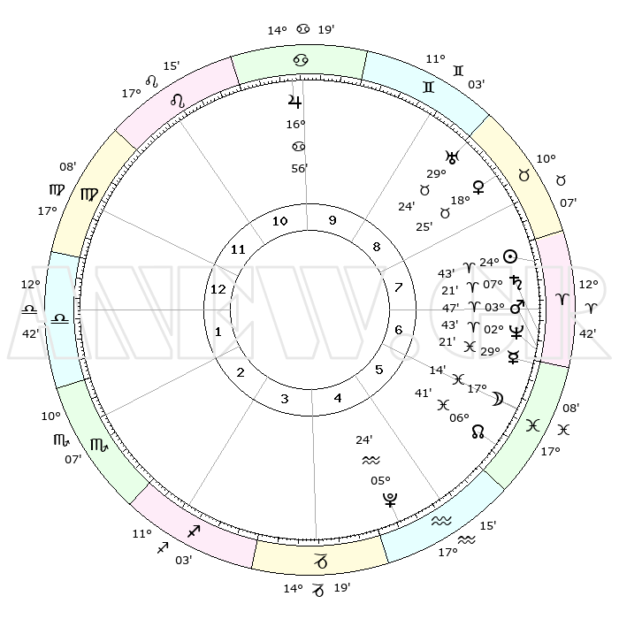 | | ΘΕΣΕΙΣ ΠΛΑΝΗΤΩΝ ΑΣΤΡΟΛΟΓΙΚΟΥ ΧΑΡΤΗ ΤΗΣ ΣΤΙΓΜΗΣ ΑΥΤΗΣ | | | | Πλανήτης | Ζώδιο | Μοίρες | Δεκαήμ. | Σε οίκο | Απόκλιση | | Ακμές των οίκων | | Ηλιος | Κριός | 24°35' | Τρίτο | 9 | 09 N 31 | | 1ος | 29°38' | Λέων | | Σελήνη | Ιχθείς | 15°14' | Δεύτερο | 7 | 05 S 14 | | 2ος | 23°27' | Παρθένος | | Ερμής | Ιχθείς | 29°08' | Τρίτο | 8 | 02 S 42 | | 3ος | 22°05' | Ζυγός | | Αφροδίτη | Ταύρος | 18°14' | Δεύτερο | 9 | 17 N 24 | | 4ος | 25°00' | Σκορπιός | | Αρης | Κριός | 03°40' | Πρώτο | 8 | 00 N 33 | | 5ος | 29°13' | Τοξότης | | Δίας | Καρκίνος | 16°55' | Δεύτερο | 11 | 22 N 44 | | 6ος | 01°12' | Υδροχόος | | Κρόνος | Κριός | 07°20' | Πρώτο | 8 | 00 N 56 | | 7ος | 29°38' | Υδροχόος | | Ουρανός | Ταύρος | 29°24' | Τρίτο | 10 | 19 N 51 | | 8ος | 23°27' | Ιχθείς | | Ποσειδώνας | Κριός | 02°42' | Πρώτο | 8 | 00 S 08 | | 9ος | 22°05' | Κριός | | Πλούτωνας | Υδροχόος | 05°24' | Πρώτο | 6 | 22 S 47 | | 10ος | 25°00' | Ταύρος | | Β. Δεσμός | Ιχθείς | 06°41' | Πρώτο | 7 | 09 S 03 | | 11ος | 29°13' | Δίδυμοι | | Ωροσκόπος | Λέων | 29°38' | Τρίτο | | | 12ος | 01°12' | Λέων | | Μεσουράνημα | Ταύρος | 25°00' | Τρίτο | | | |