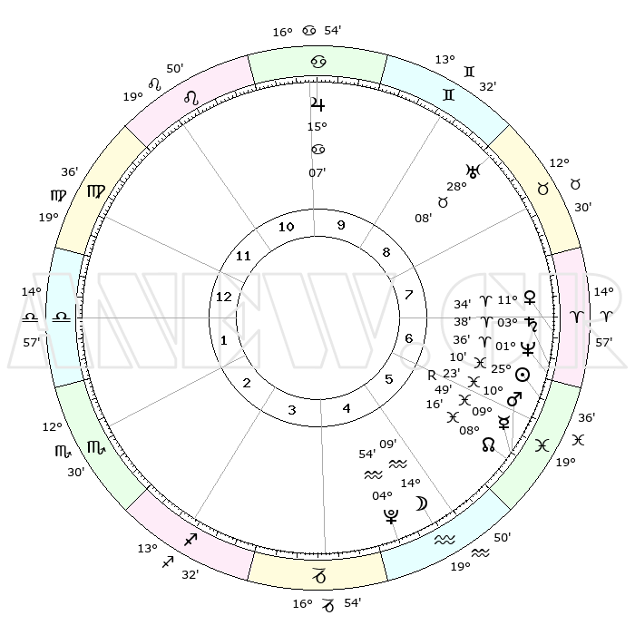 | | ΘΕΣΕΙΣ ΠΛΑΝΗΤΩΝ ΑΣΤΡΟΛΟΓΙΚΟΥ ΧΑΡΤΗ ΤΗΣ ΣΤΙΓΜΗΣ ΑΥΤΗΣ | | | | Πλανήτης | Ζώδιο | Μοίρες | Δεκαήμ. | Σε οίκο | Απόκλιση | | Ακμές των οίκων | | Ηλιος | Ιχθείς | 25°07' | Τρίτο | 6 | 01 S 57 | | 1ος | 27°46' | Παρθένος | | Σελήνη | Υδροχόος | 13°24' | Δεύτερο | 5 | 18 S 59 | | 2ος | 24°11' | Ζυγός | | Ερμής | Ιχθείς | 09°51'R | Πρώτο | 6 | 05 S 47 | | 3ος | 24°32' | Σκορπιός | | Αφροδίτη | Κριός | 11°30' | Δεύτερο | 7 | 03 N 36 | | 4ος | 27°29' | Τοξότης | | Αρης | Ιχθείς | 10°20' | Δεύτερο | 6 | 08 S 42 | | 5ος | 00°30' | Υδροχόος | | Δίας | Καρκίνος | 15°07' | Δεύτερο | 10 | 22 N 56 | | 6ος | 01°01' | Ιχθείς | | Κρόνος | Κριός | 03°38' | Πρώτο | 7 | 00 S 30 | | 7ος | 27°46' | Ιχθείς | | Ουρανός | Ταύρος | 28°08' | Τρίτο | 9 | 19 N 34 | | 8ος | 24°11' | Κριός | | Ποσειδώνας | Κριός | 01°36' | Πρώτο | 7 | 00 S 34 | | 9ος | 24°32' | Ταύρος | | Πλούτωνας | Υδροχόος | 04°54' | Πρώτο | 5 | 22 S 49 | | 10ος | 27°29' | Δίδυμοι | | Β. Δεσμός | Ιχθείς | 08°16' | Πρώτο | 6 | 08 S 28 | | 11ος | 00°30' | Λέων | | Ωροσκόπος | Παρθένος | 27°46' | Τρίτο | | | 12ος | 01°01' | Παρθένος | | Μεσουράνημα | Δίδυμοι | 27°29' | Τρίτο | | | |
